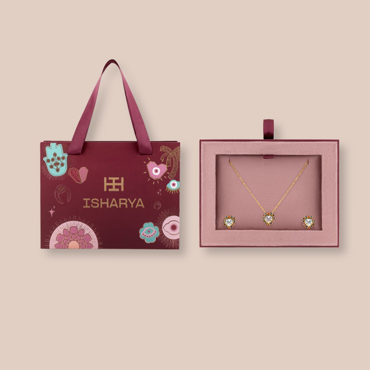 This necklace set from I For Isharya features a cute pendant necklace and matching earrings. Crafted from brass and plated with 18k gold with CZ stones, this set is perfect for gifting or keeping. Wear it from AM to PM for parties, brunches and everything in between.