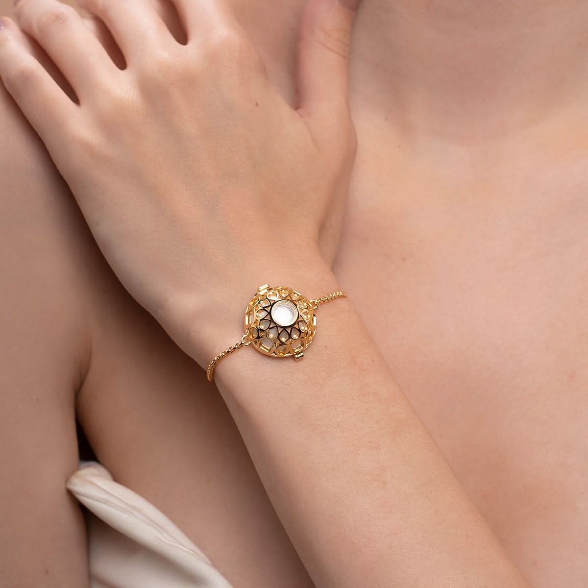 This 18-karat gold-plated style is set with shimmering crystals and features a luminous pearl and the iconic Isharya logo. The Mughal-inspired bolo bracelet is so easy to adjust.