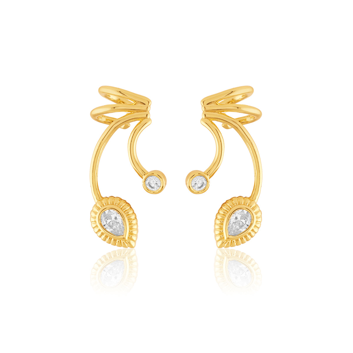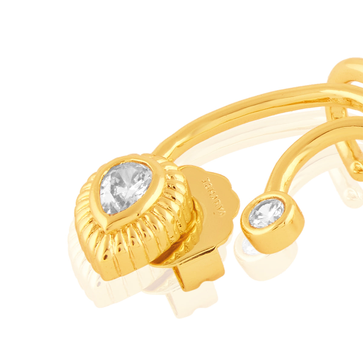 Make a bold statement with these gold-and-white ear climbers from I For Isharya. Crafted in brass with 18k gold plating and crystal zirconia, they reimagine temple motifs as future heirlooms. Perfect for weddings, soirées, and festive nights. Shop this modern luxury now.