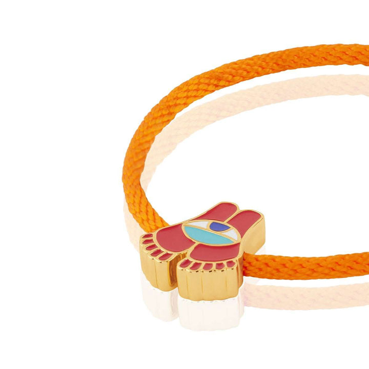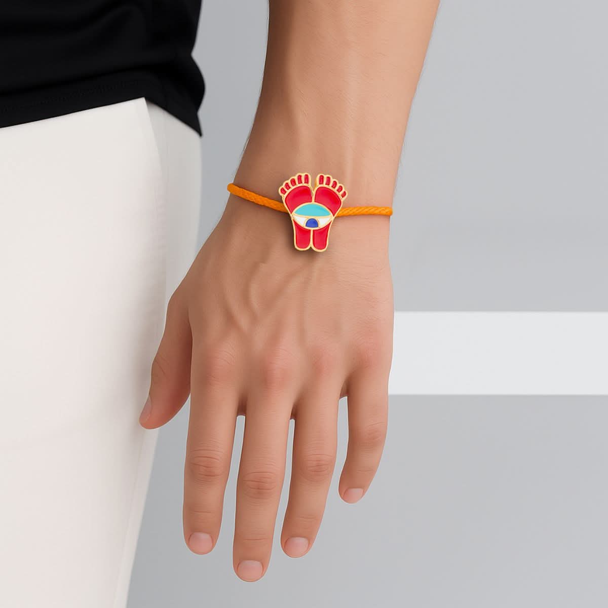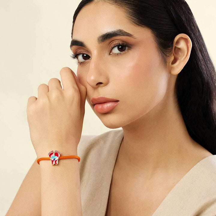 The Laxmi Rakhi Bracelet features a divine charm in red and blue enamel on a rich red cord, crafted in hypoallergenic 18k gold-plated brass. A bold, symbolic piece rooted in spiritual abundance and Raksha Bandhan traditions.