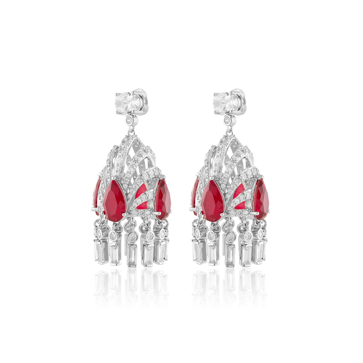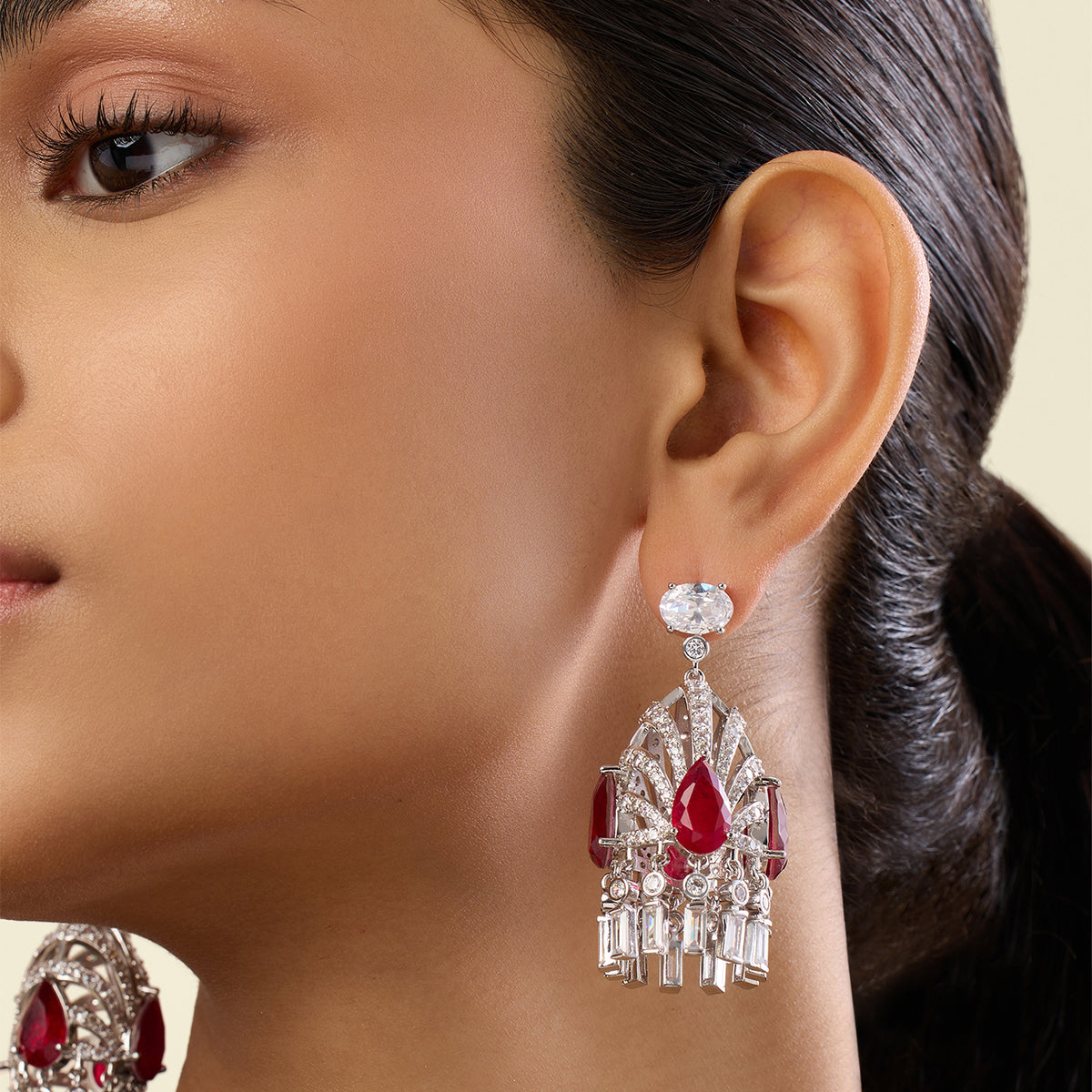 Turn heads with Isharya’s white and red earrings, featuring special-cut crystal zirconia and Botox rubies. Crafted in brass with rhodium plating, these hypoallergenic statement earrings exude timeless glamour. Perfect for weddings, festive soirées, and cocktail nights. Shop unmatched luxury now.