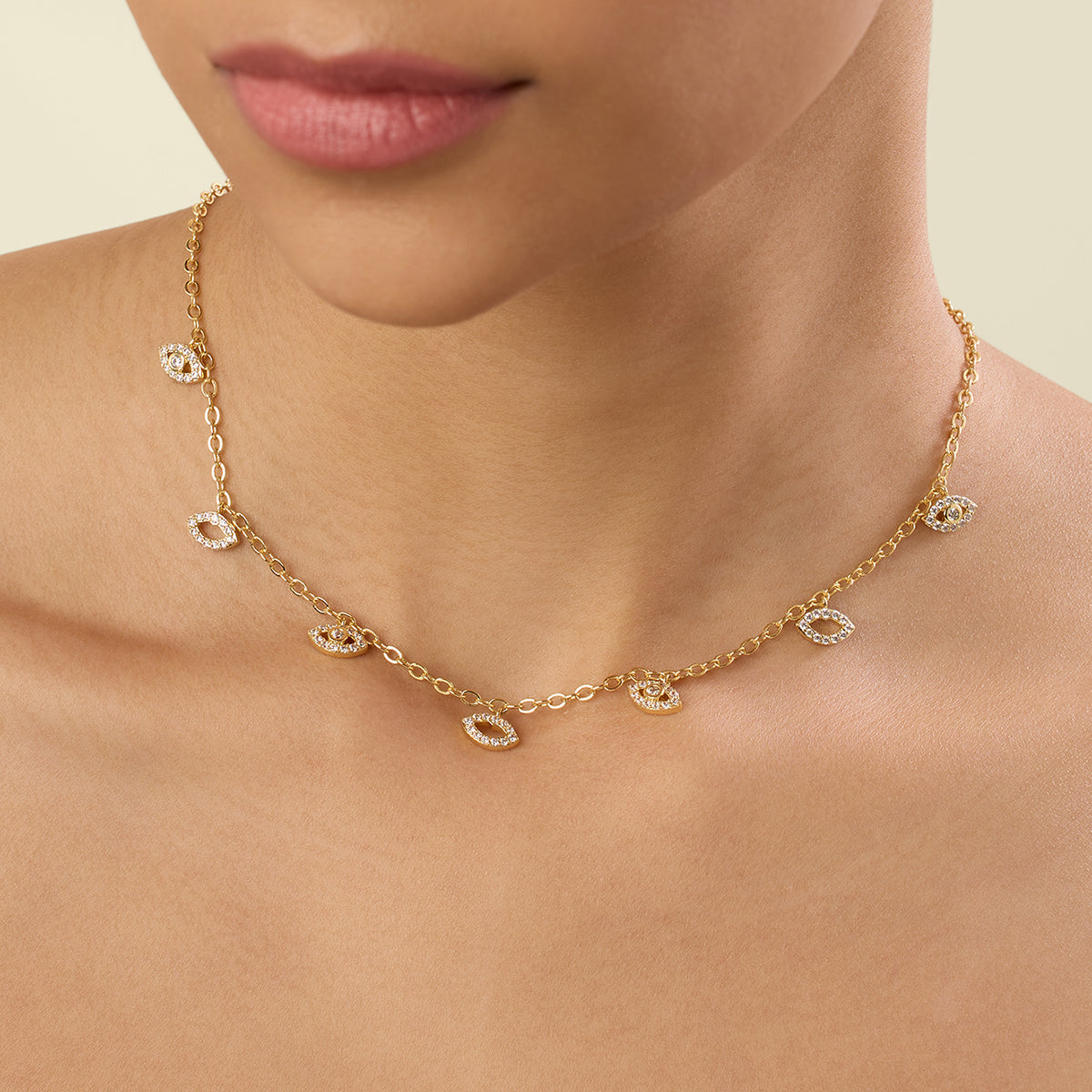 Inspired by surrealism, this statement necklace fuses bold design with refined craftsmanship. Featuring crystal zirconia and 18k gold plating, it’s the perfect stackable piece for cocktail soirées or glam nights out. Elevate your party look—shop I For Isharya now.