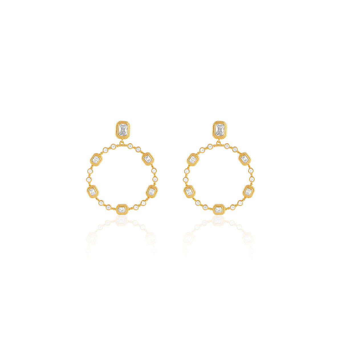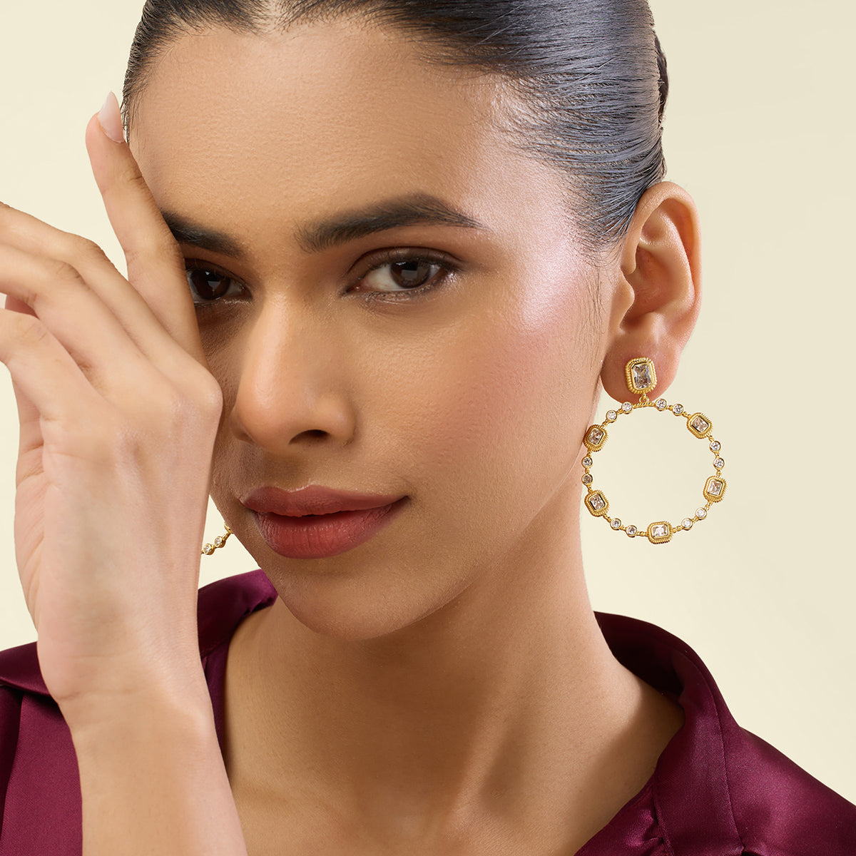 Make a bold statement with these gold-and-white danglers from I For Isharya. Crafted in brass with 18k gold plating and crystal zirconia, they reimagine temple motifs as future heirlooms. Perfect for weddings, soirées, and festive nights. Shop this modern luxury now.