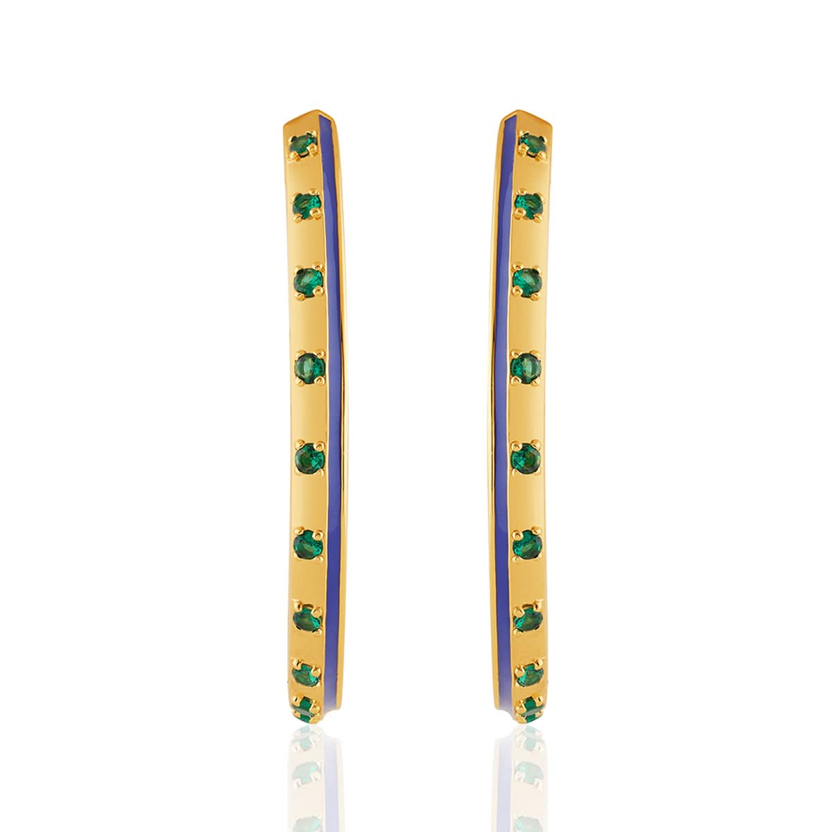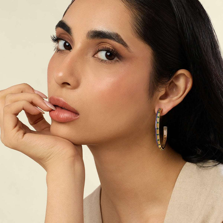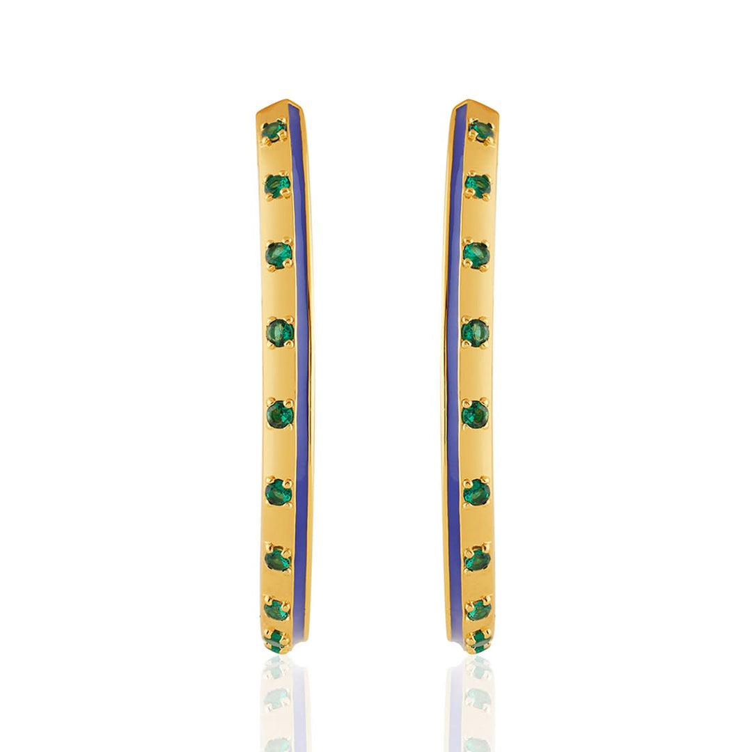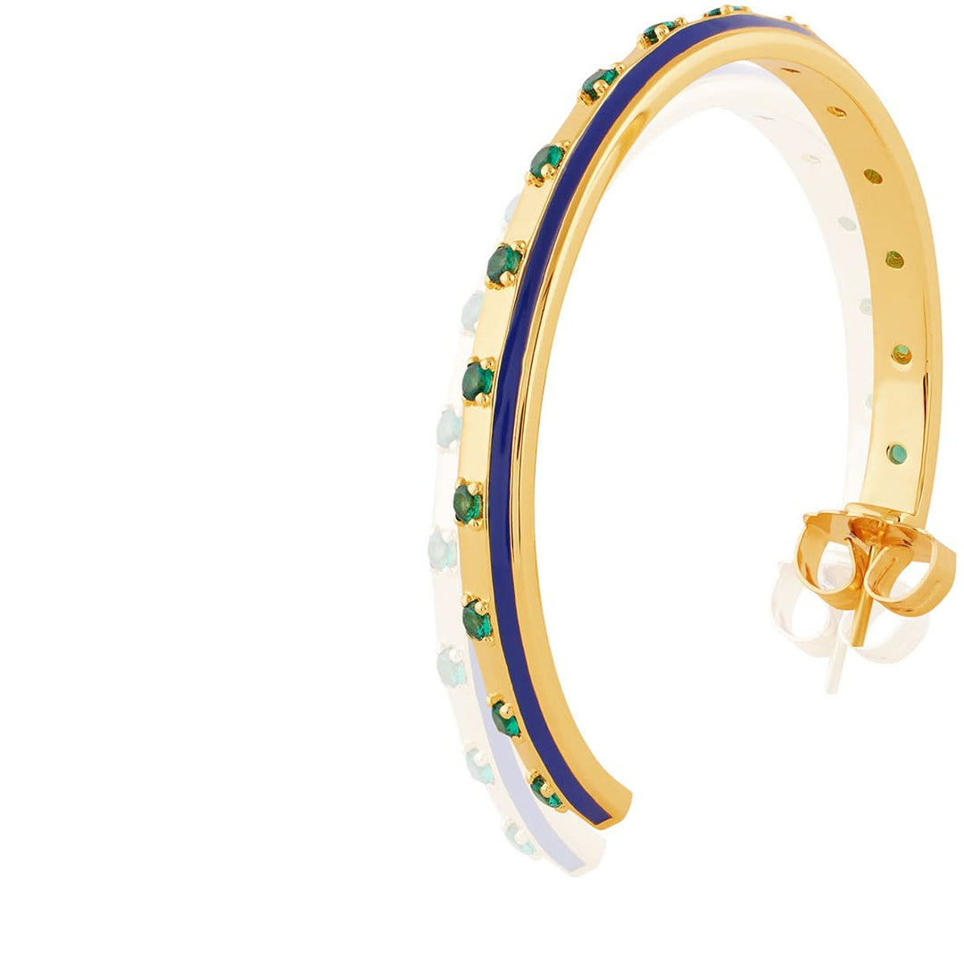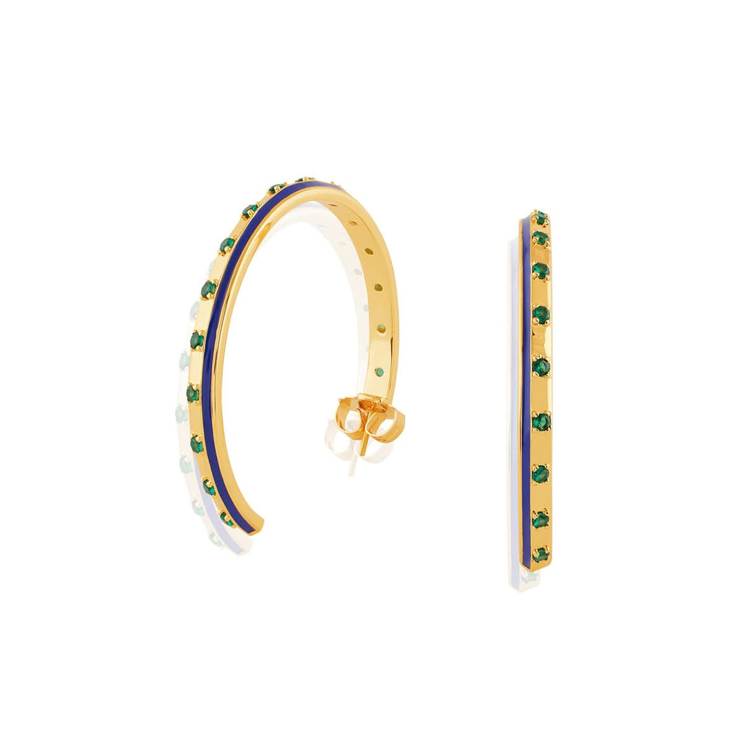 The Luna Luxe Hoops shine with blue enamel, green accents, and crystal zirconia set in 18k gold-plated brass. Bold yet wearable, they’re hypoallergenic and inspired by healing symbols and celestial energy.