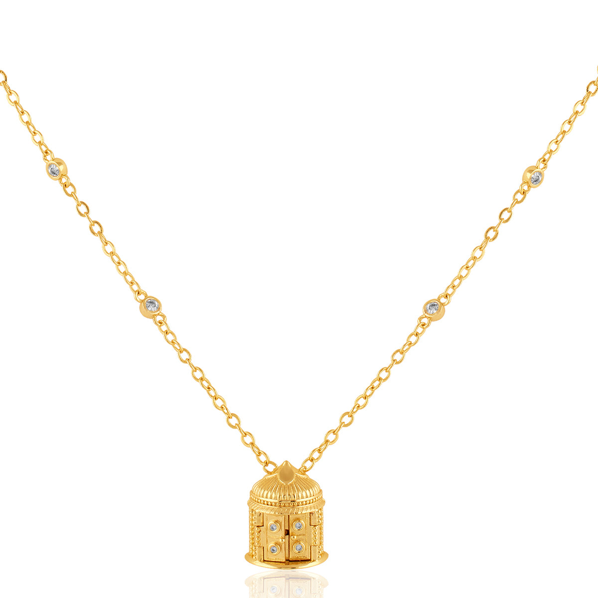 Sleek yet striking, this gold-and-white pendant necklace is crafted in brass with 18k gold plating and zirconia stones. Inspired by future heirlooms, it reimagines temple motifs for today. Perfect for festive soirées or wedding nights. Stack, style, shine—shop now. P.S. the pendant has an openable feature.