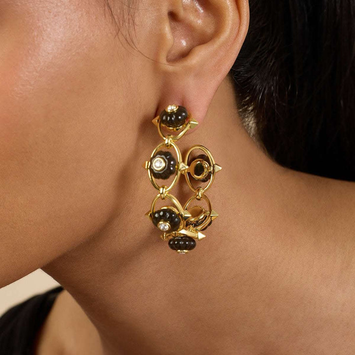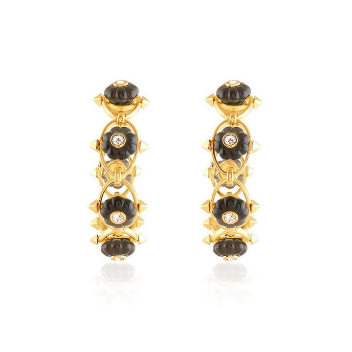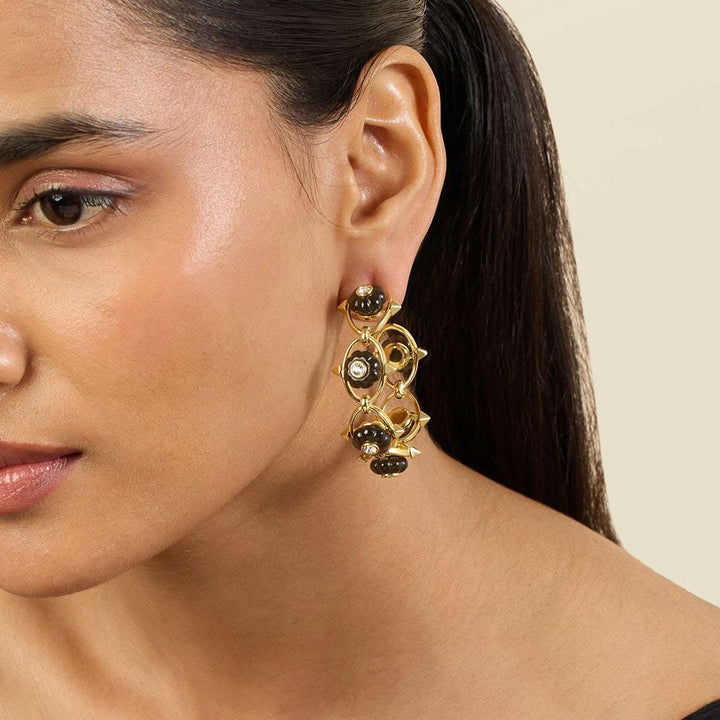Bold, moody, and magnetic—these statement hoop earrings in black and gold are crafted in 18k gold-plated brass with sparkling crystal zirconia and resin detailing. Hypoallergenic and garden-inspired, they’re made for standout moments.