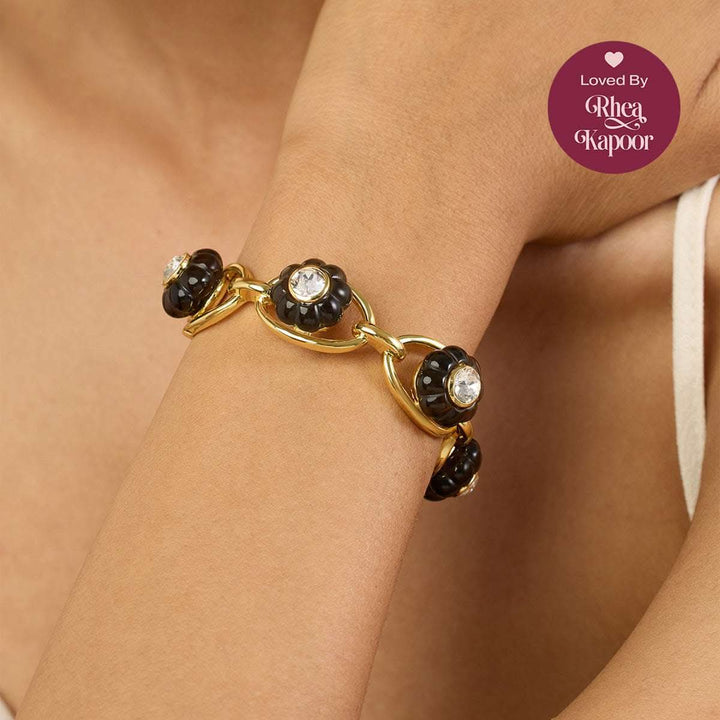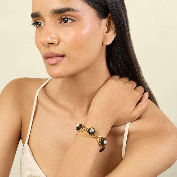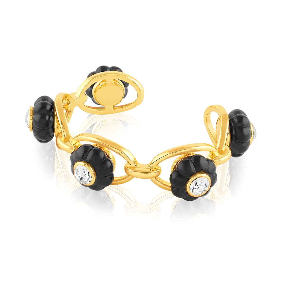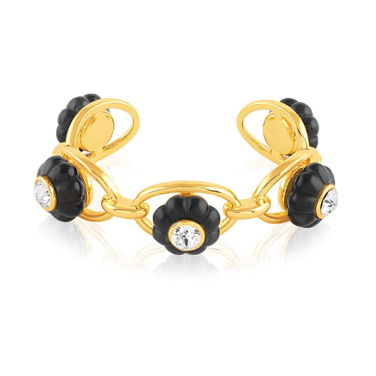 Elevate your look with this bold cuff in black and gold, featuring crystal zirconia and resin work. Crafted from 18k gold-plated brass, it draws inspiration from whimsical garden motifs like flowers and dragonflies. Hypoallergenic and luxurious.