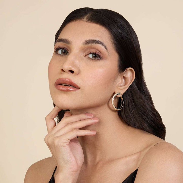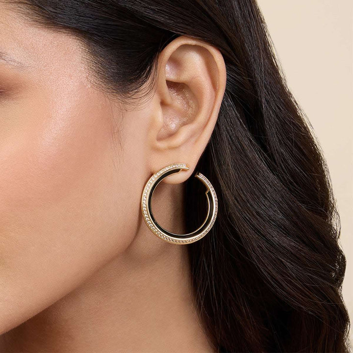 Expertly crafted with black CZ and enamel, these Midnight Magic Hoops are a versatile accessory for any occasion. Made from gold plated brass and featuring an e-coating for durability, these statement earrings are a must-have addition to your jewelry collection. Style with any outfit for a touch of sophisticated glamour.