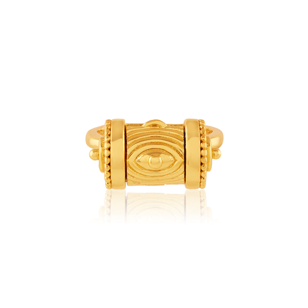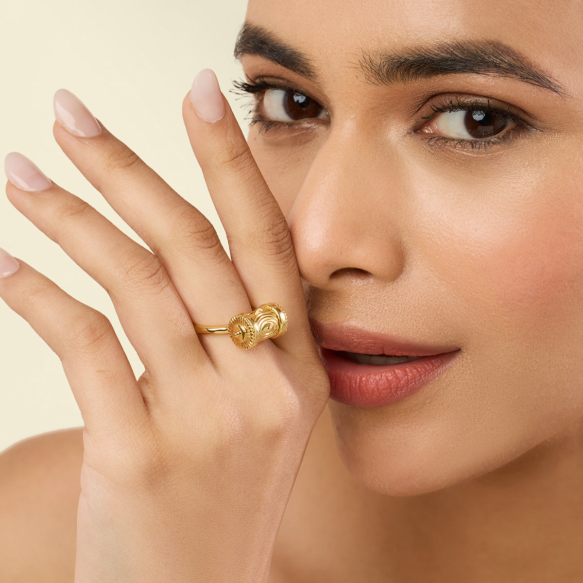 Unlock timeless style and store your sweetest secrets with our openable talisman ring. Crafted in brass with 18k gold plating and zirconia stones, it reimagines temple motifs as future heirlooms. Stack it or wear solo—perfect for festive nights, weddings, and parties. Shop the sparkle now.