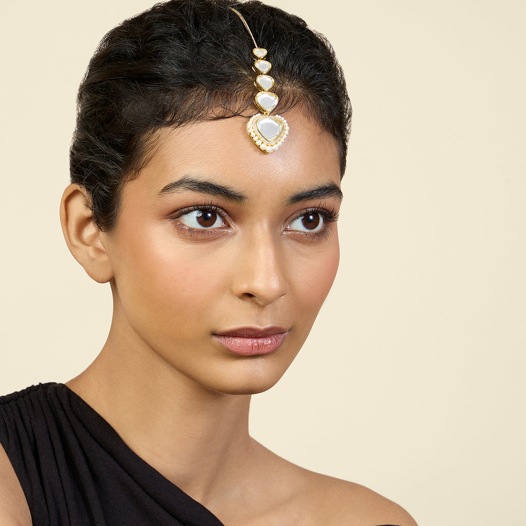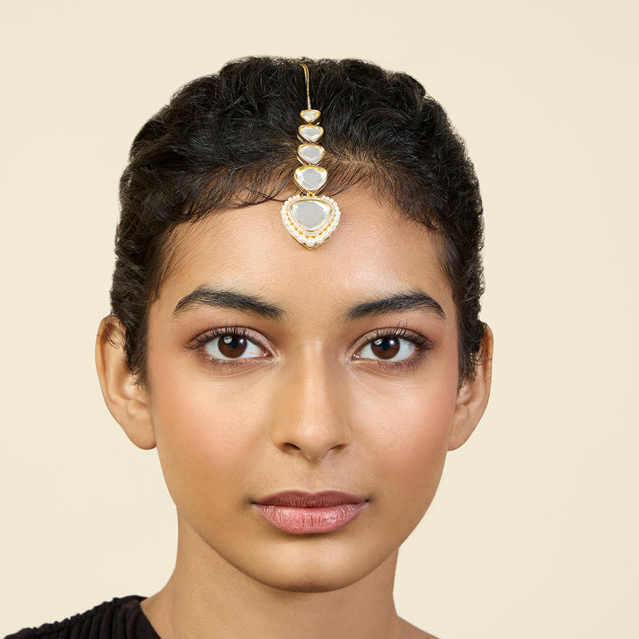 Discover the elegance of our Mirror Boondein Maang Tikka, featuring a gold plating with e-coating for superior shine and durability. The intricately designed head gear boasts a gorgeous display of pearls and CZ, making it the perfect accessory to elevate any outfit. Crafted from brass, this maang tikka is a must-have for any fashion girlie.