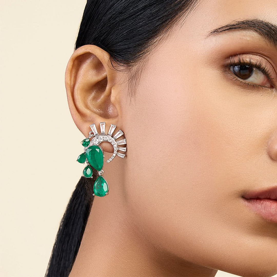 Relive the Art Deco era with these Mor Emerald Statement Studs. A perfect combination of CZ and Doublet Dark emerald, these rhodium-plated studs add a touch of elegance to any outfit.