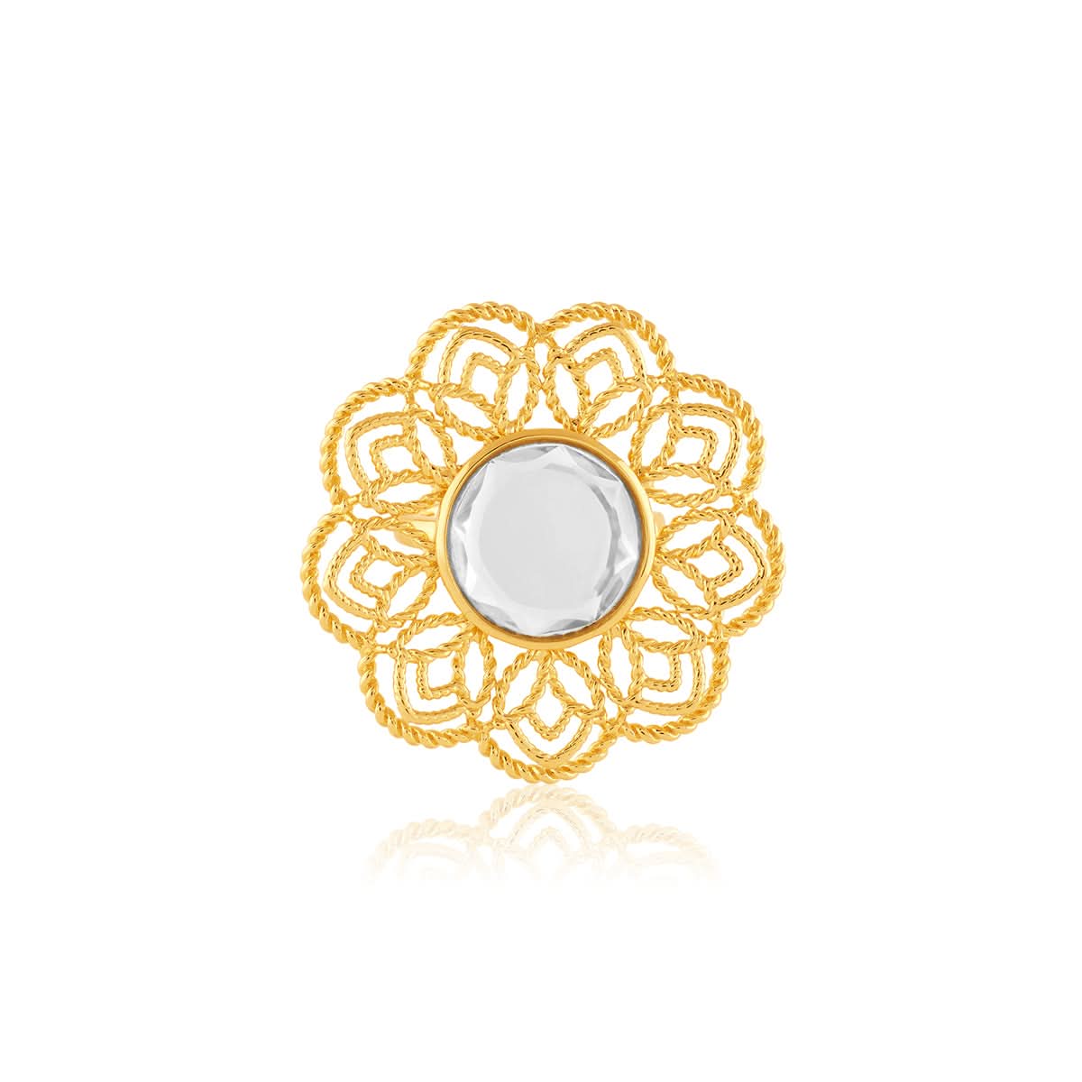 Crafted in brass with 18k gold plating, this bold gold-and-white statement ring features hand-cut mirrors and Portuguese-inspired filigree with Isharya’s signature artistry. Perfect for parties, weddings, and celebrations. Make it yours—shop now.