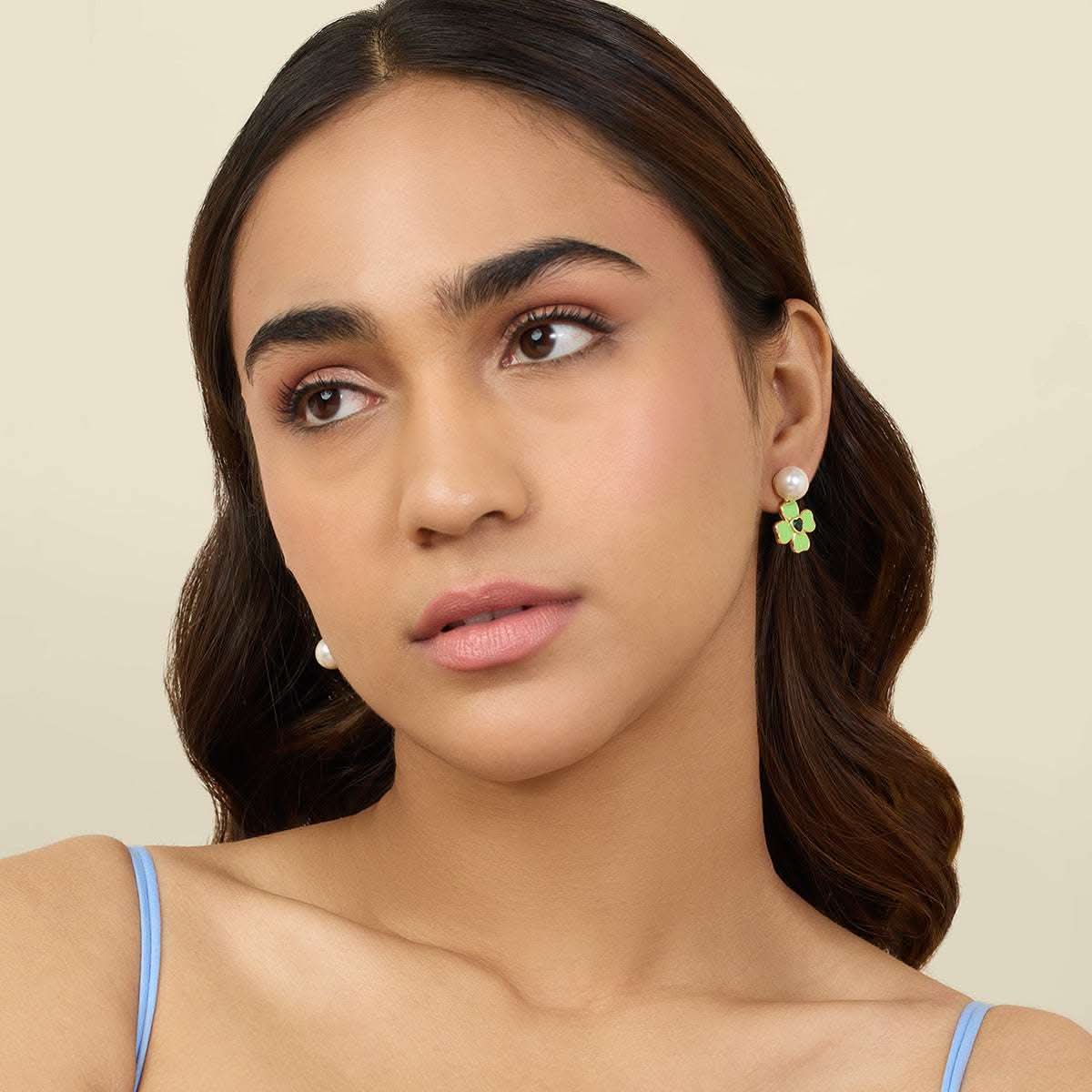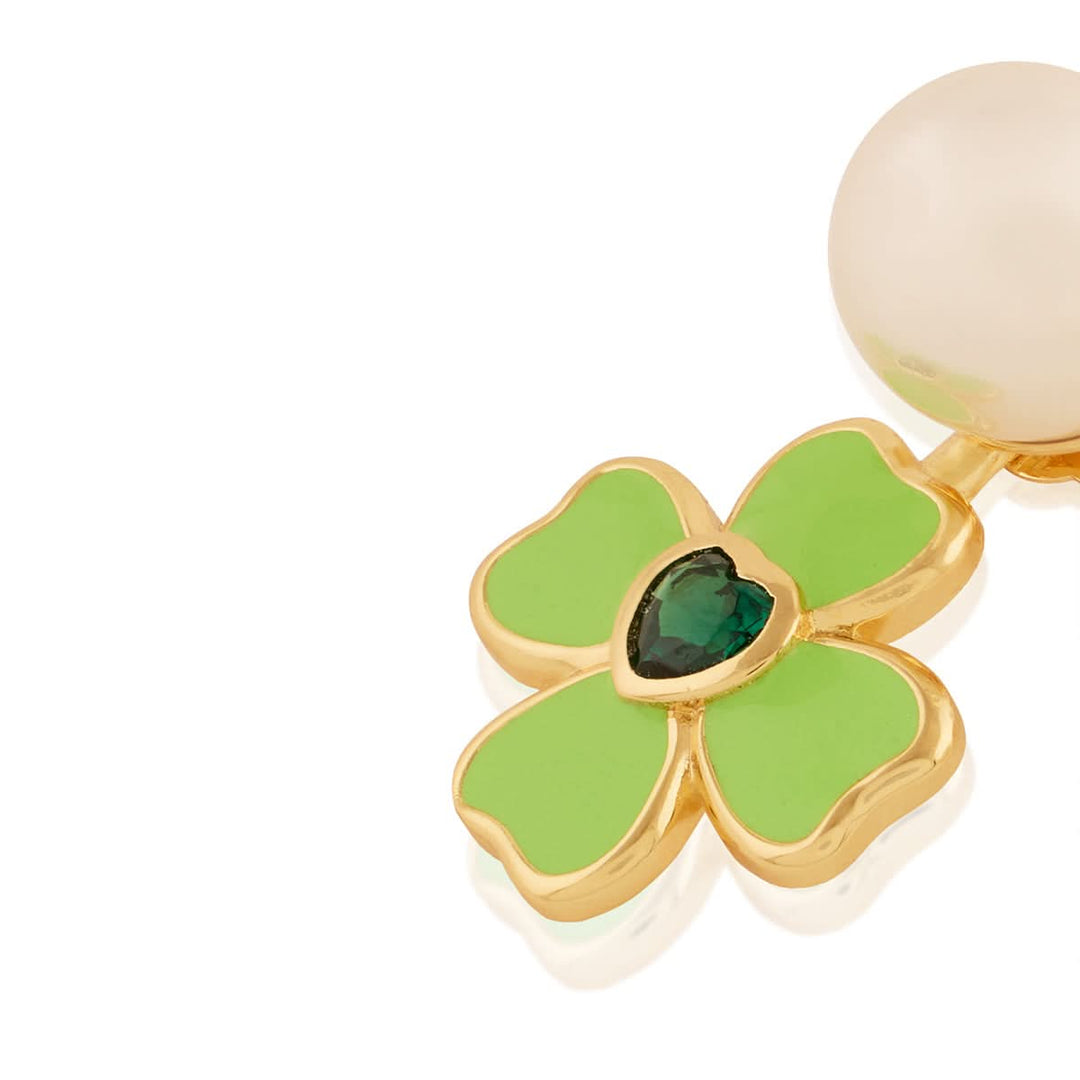 Inspired by the playful spirit of summer, these earrings are crafted in brass and plated with 18k gold. Featuring enamel work, pearls and crystal zirconia stones, these lightweight earrings offer the perfect pops of colour to everything from sundresses to linen shirts.