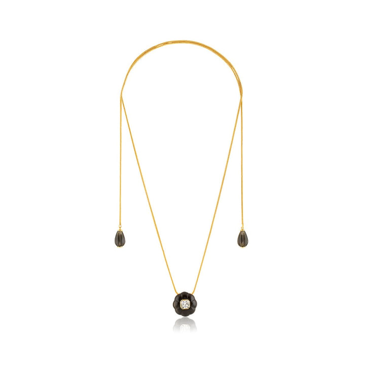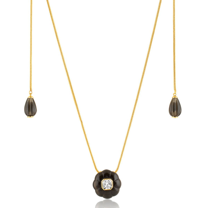 Embrace bold elegance with this statement necklace in black and gold. Crafted in 18k gold-plated brass, it features crystal zirconia and resin work, inspired by enchanting garden motifs like flowers, snails, and dragonflies. Hypoallergenic and luxurious.