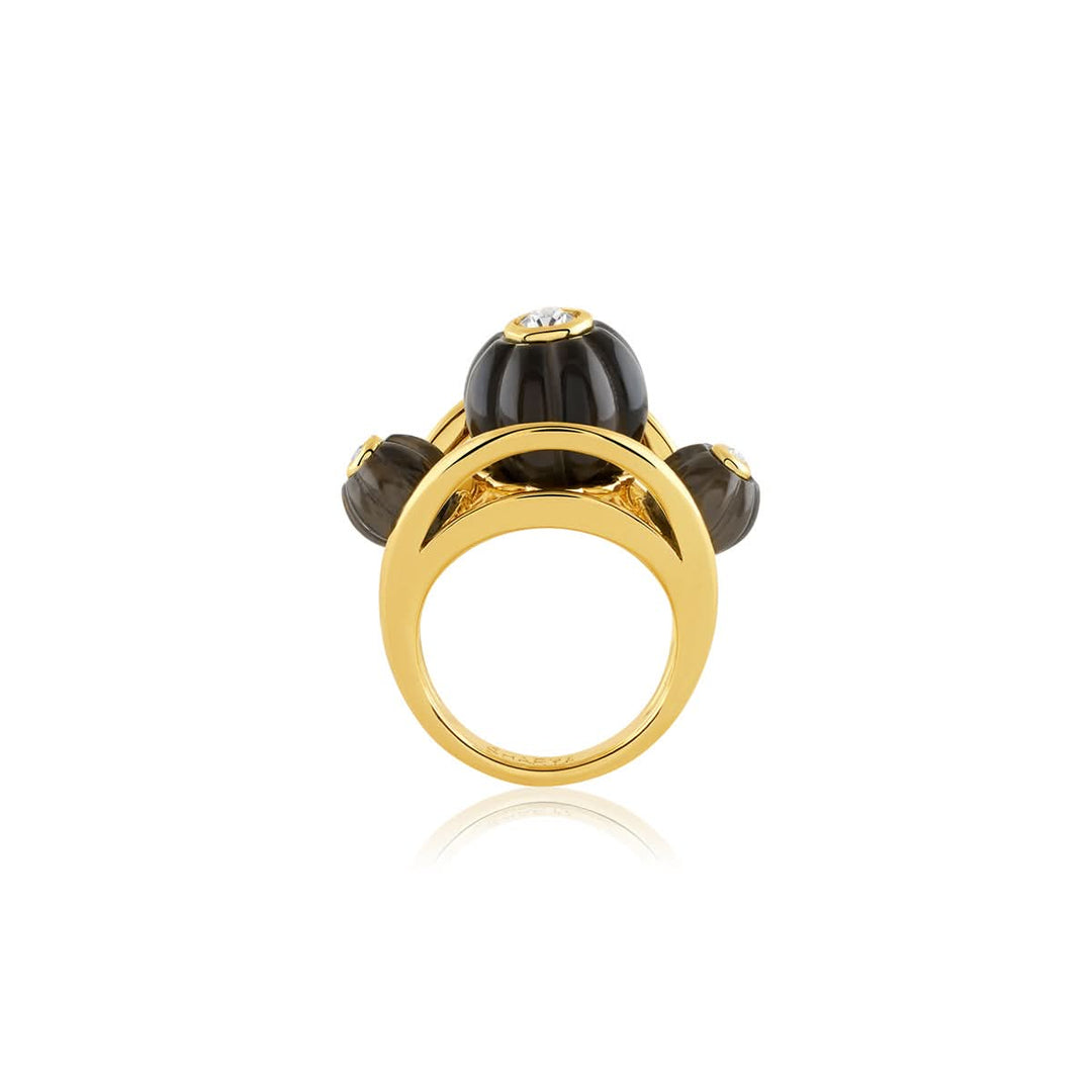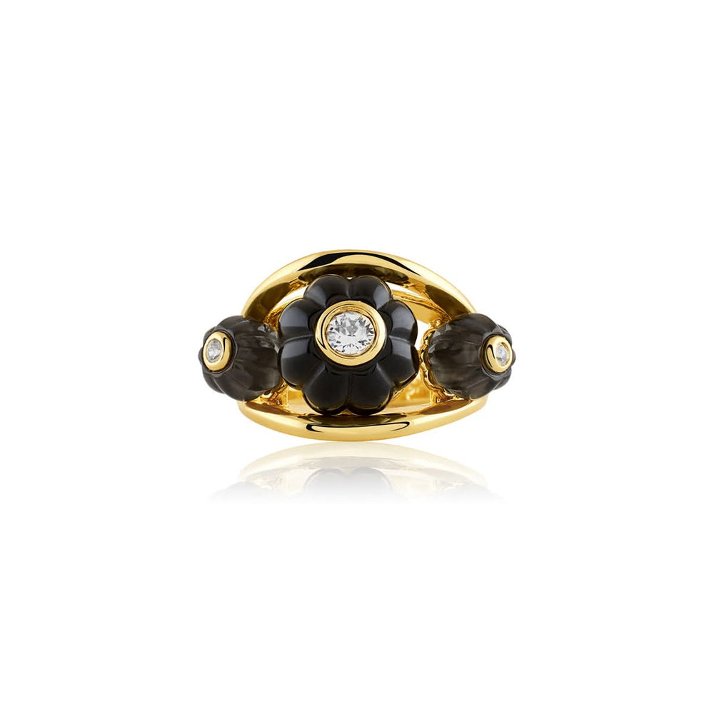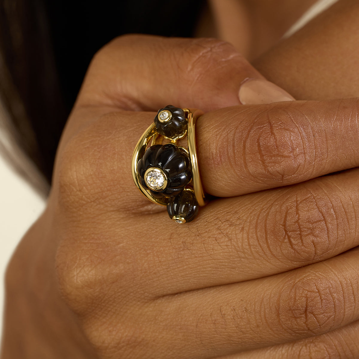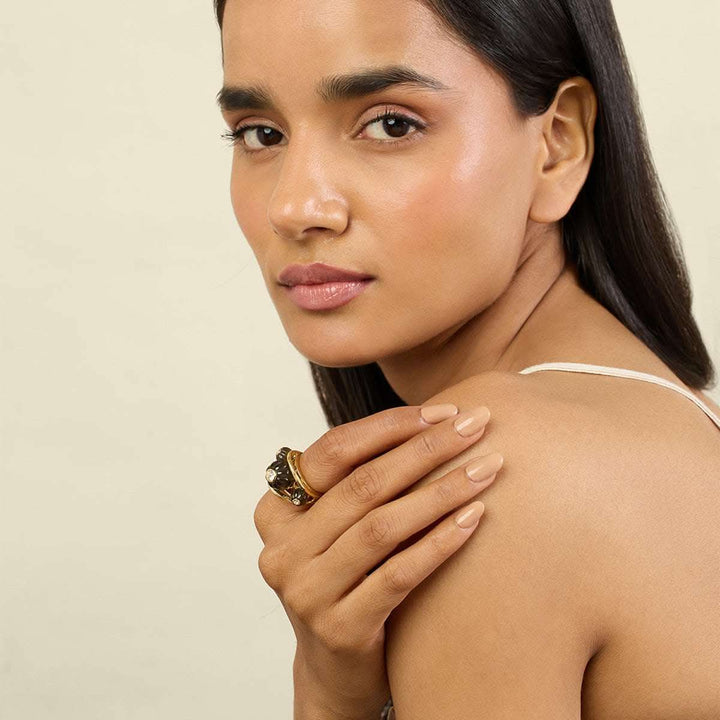 Embrace bold elegance with this statement ring in black and gold. Featuring crystal zirconia and resin work, this piece is crafted from 18k gold-plated brass and inspired by enchanting garden motifs. Hypoallergenic and sophisticated.