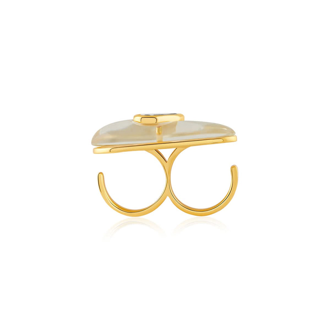 Expertly crafted with gold plating and e-coating, the Noor Two Finger Ring makes a bold statement. Its unique design features a two finger ring with a stunning gold finish, adorned with resin and a mirrored brass accent. Elevate your festive style with this eye-catching accessory.