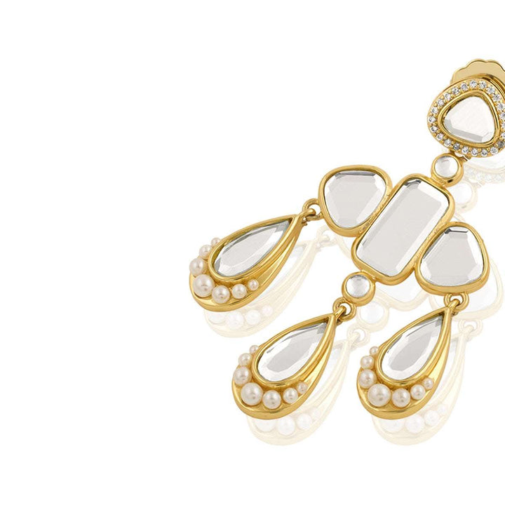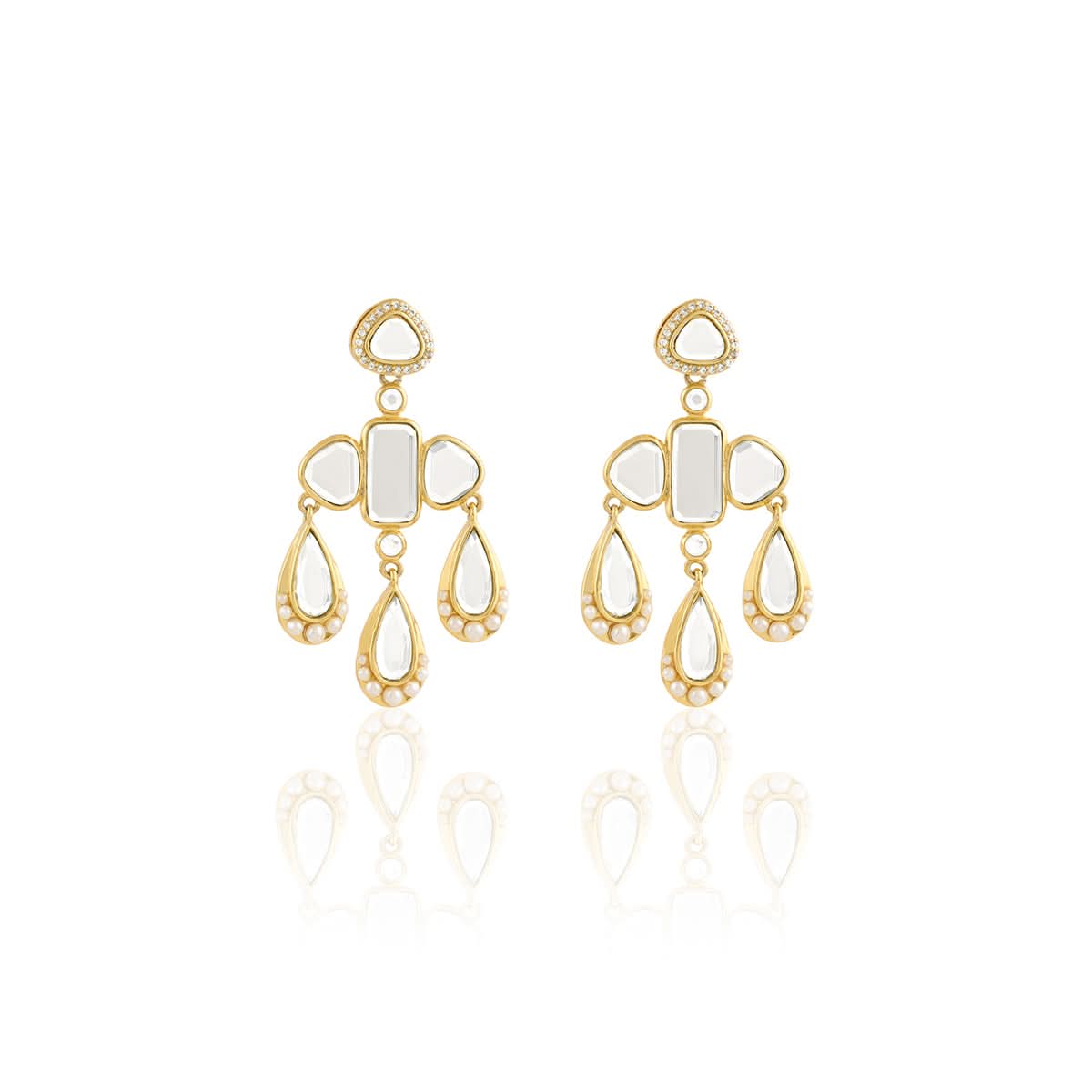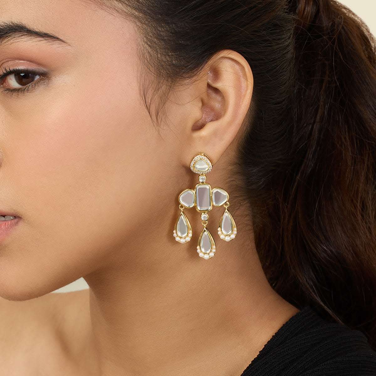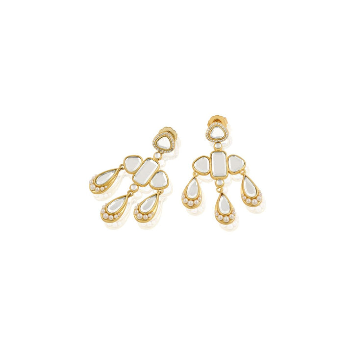 Enhance your festive elegance with Noorana Drop Danglers. Featuring a unique gold plating with e-coating, these danglers add a touch of luxury to your style. The long, dangler design, along with the stunning combination of gold, mirror, pearl, and Cz, make these earrings a must-have for any outfit. Made with high-quality brass, these earrings are both durable and stylish. Elevate your look with Noorana Drop Danglers.