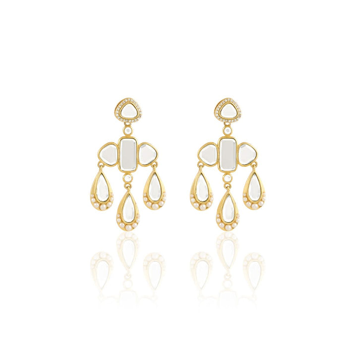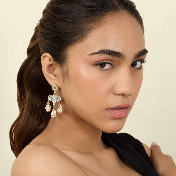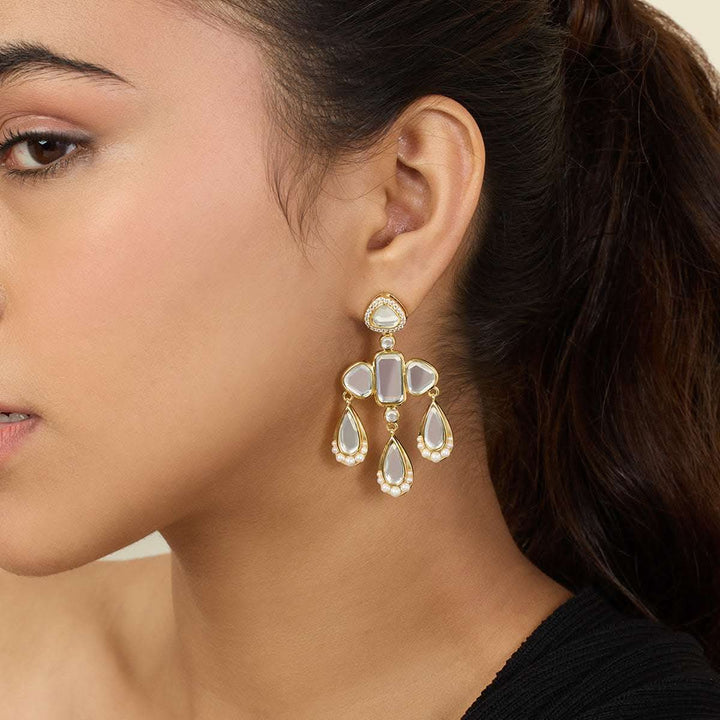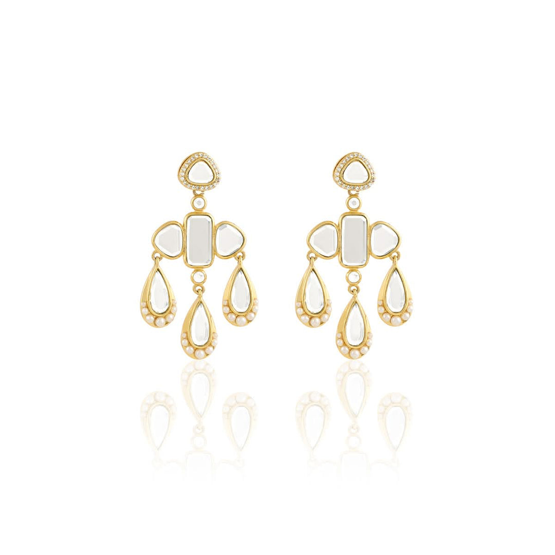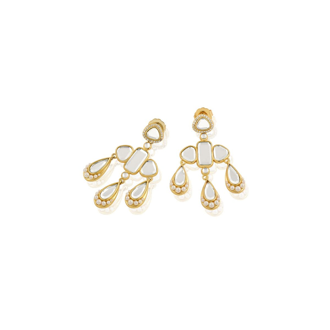 Enhance your festive elegance with Noorana Drop Danglers. Featuring a unique gold plating with e-coating, these danglers add a touch of luxury to your style. The long, dangler design, along with the stunning combination of gold, mirror, pearl, and Cz, make these earrings a must-have for any outfit. Made with high-quality brass, these earrings are both durable and stylish. Elevate your look with Noorana Drop Danglers.