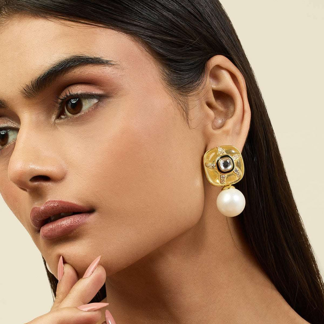 Inspired by the aquatic life, these earrings are crafted in brass and plated with 18k gold. Perfect to kickstart summer dressing, these earrings featuring resin work, pearls, enamel work and white crystals will elevate everything from breezy sun dresses to floral jumpsuits.
