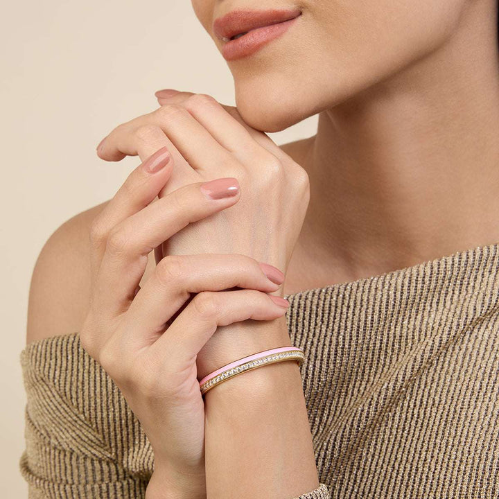 Add a pop of color to any outfit with our Pink Disco Cuff Bracelet. Made with CZ and coated in gold for a striking finish. The enamel and brass materials ensure durability. Perfect for wristwear to elevate your look.