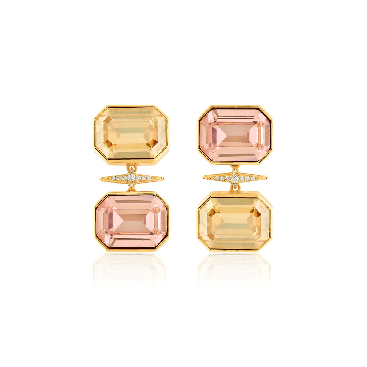 lluminate every occasion with these statement earrings, crafted in brass with 18k gold plating. Featuring crystal zirconia stones, they echo cosmic constellations and ancient symbolism. Perfect for weddings, cocktails, and festive nights.