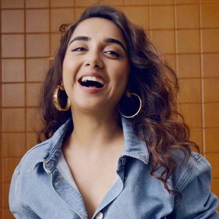 These vintage-inspired Mirror Joy Hoop earrings are crafted in brass and plated with 18k gold. They feature exquisite mirror work in a statement silhouette. Style them with everything from heirloom sarees to cocktail dresses for every celebration.