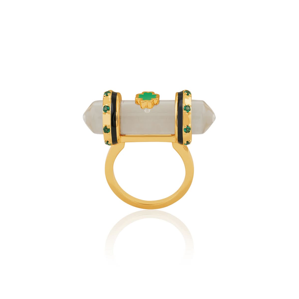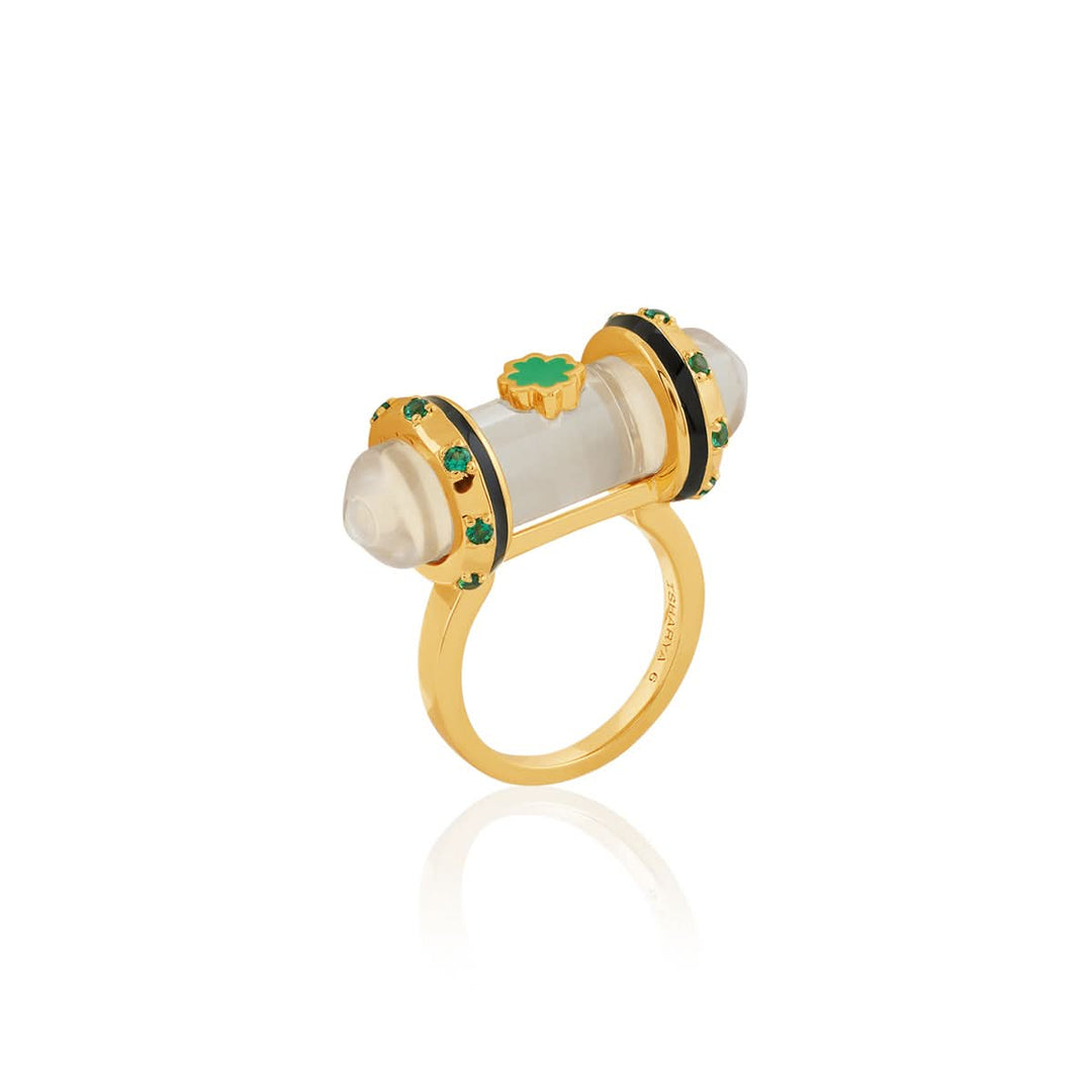 Channel clarity and confidence with the Quartz Clarity Amulet Ring. Featuring a luminous clear quartz, black and green enamel detailing, and white CZ accents, this 18k gold-plated ring is your daily dose of statement and symbolism. Style it solo or stacked for parties or everyday magic.