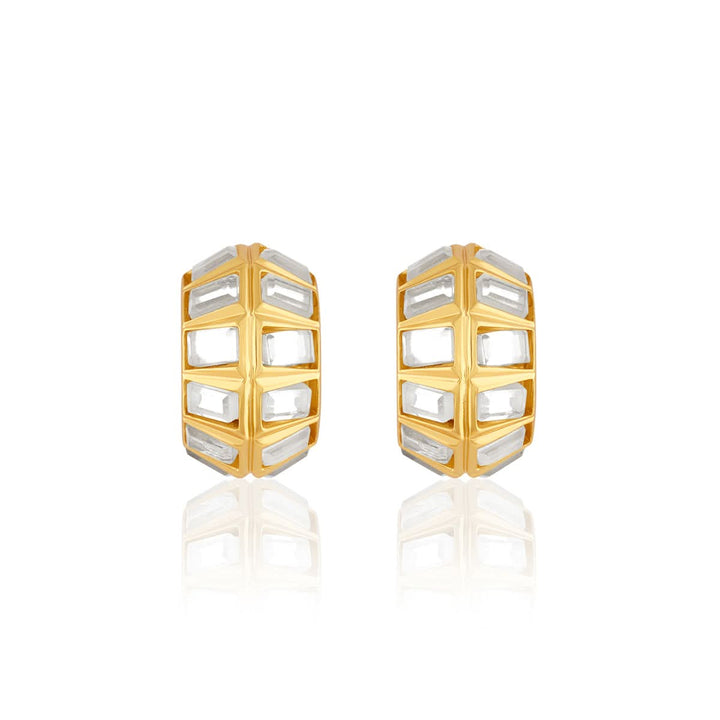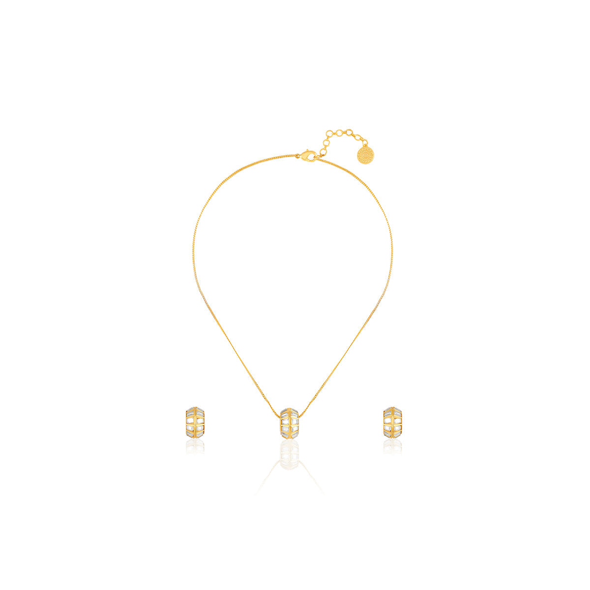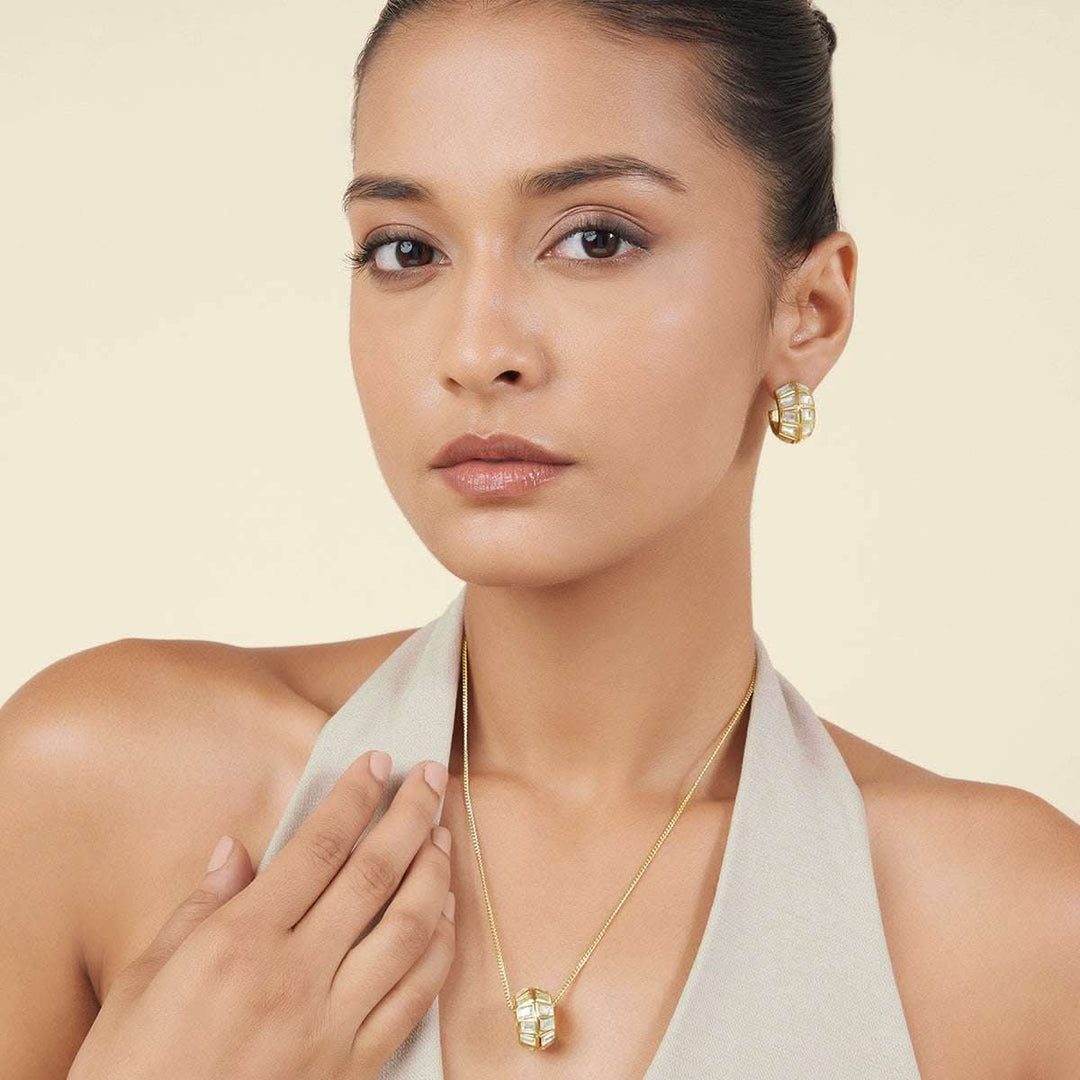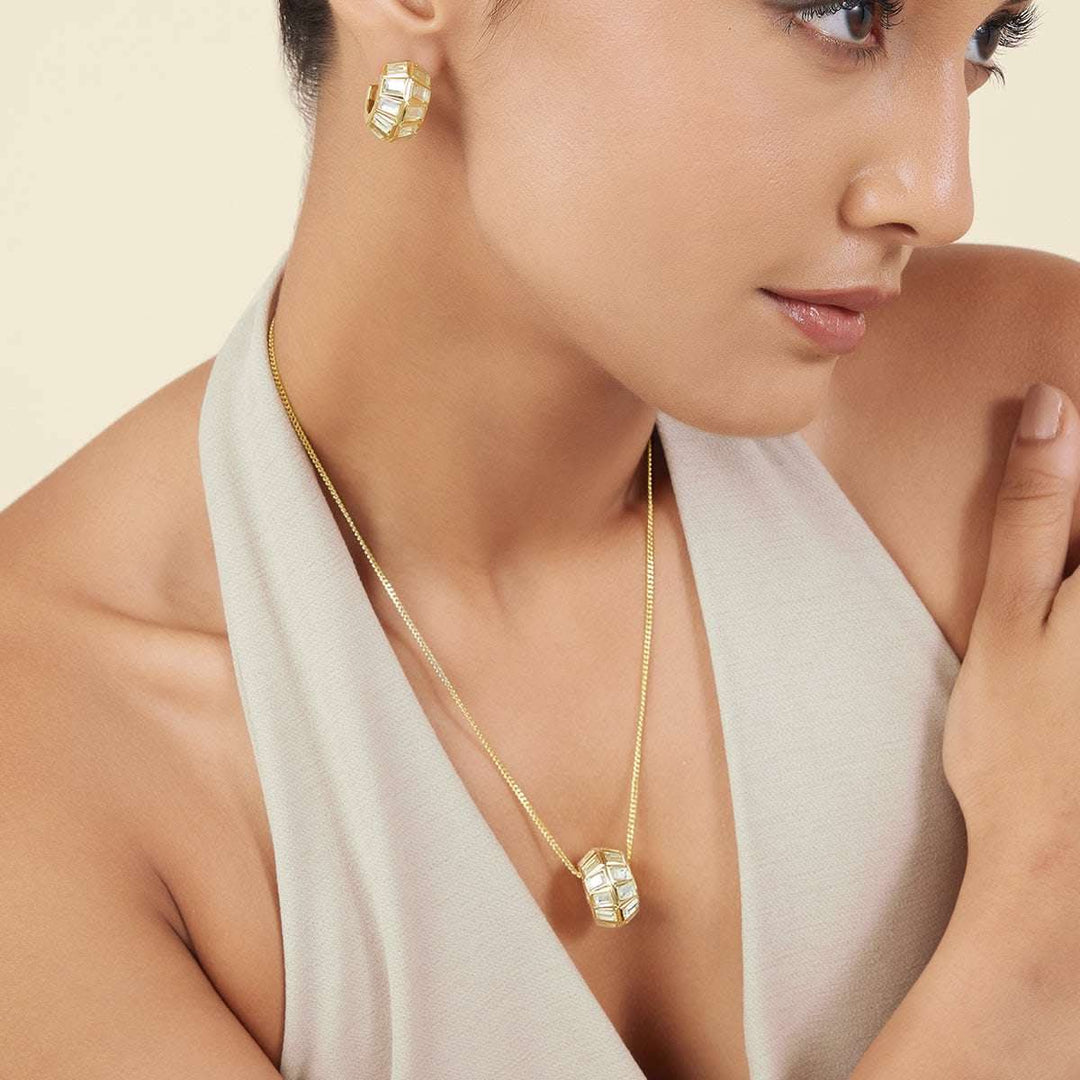 Elevate your style with the Radiance Duo Earrings & Necklace Set from the Keepers collection. This bold, statement jewellery set features hand-cut mirrors and 18k gold plating. Inspired by the Art Deco era, it’s perfect for social gatherings, parties, or everyday wear. Crafted in brass and hypoallergenic for lasting comfort.