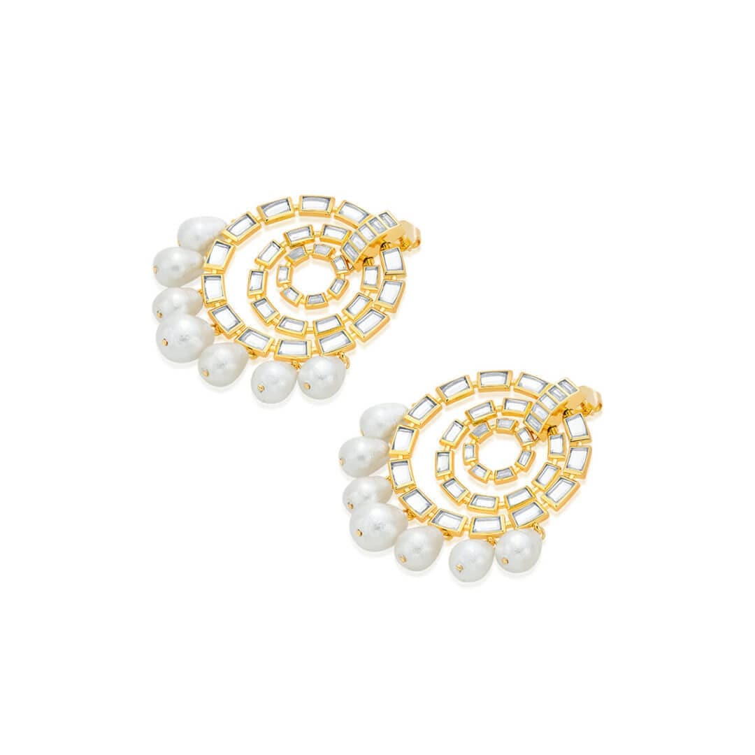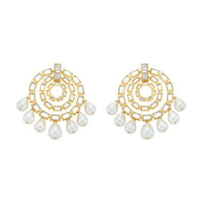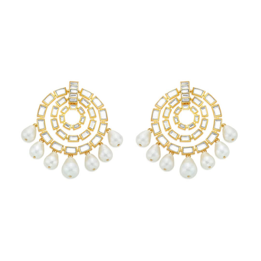 Concentric baguette hand-cut polki mirror chandelier earrings in gold plating accented by cotton pearl drops. Pack these for the next destination wedding you attend and you may just find yourself wearing these statement earrings again and again.