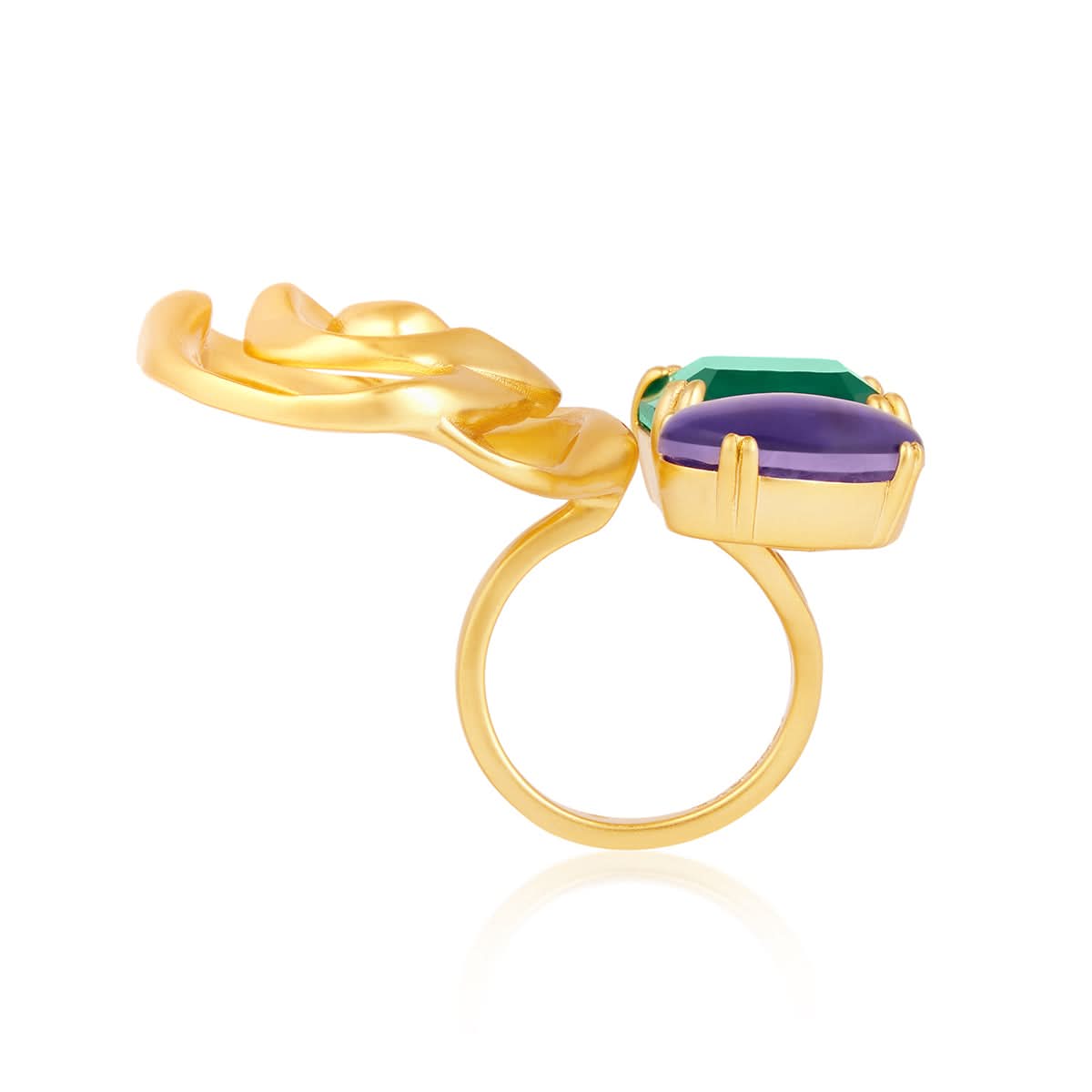 This vintage-inspired Rosé Gems Open Ring is crafted in brass and plated with 18k gold. It features exquisite green doublet and purple CZ stone with a statement rose detailing. Style it with everything from heirloom sarees to cocktail dresses for every celebration.