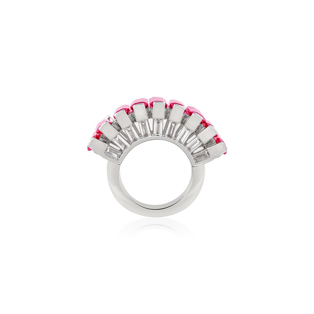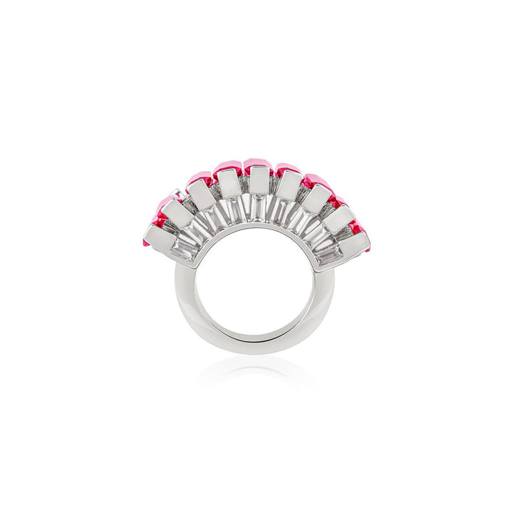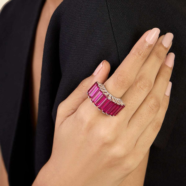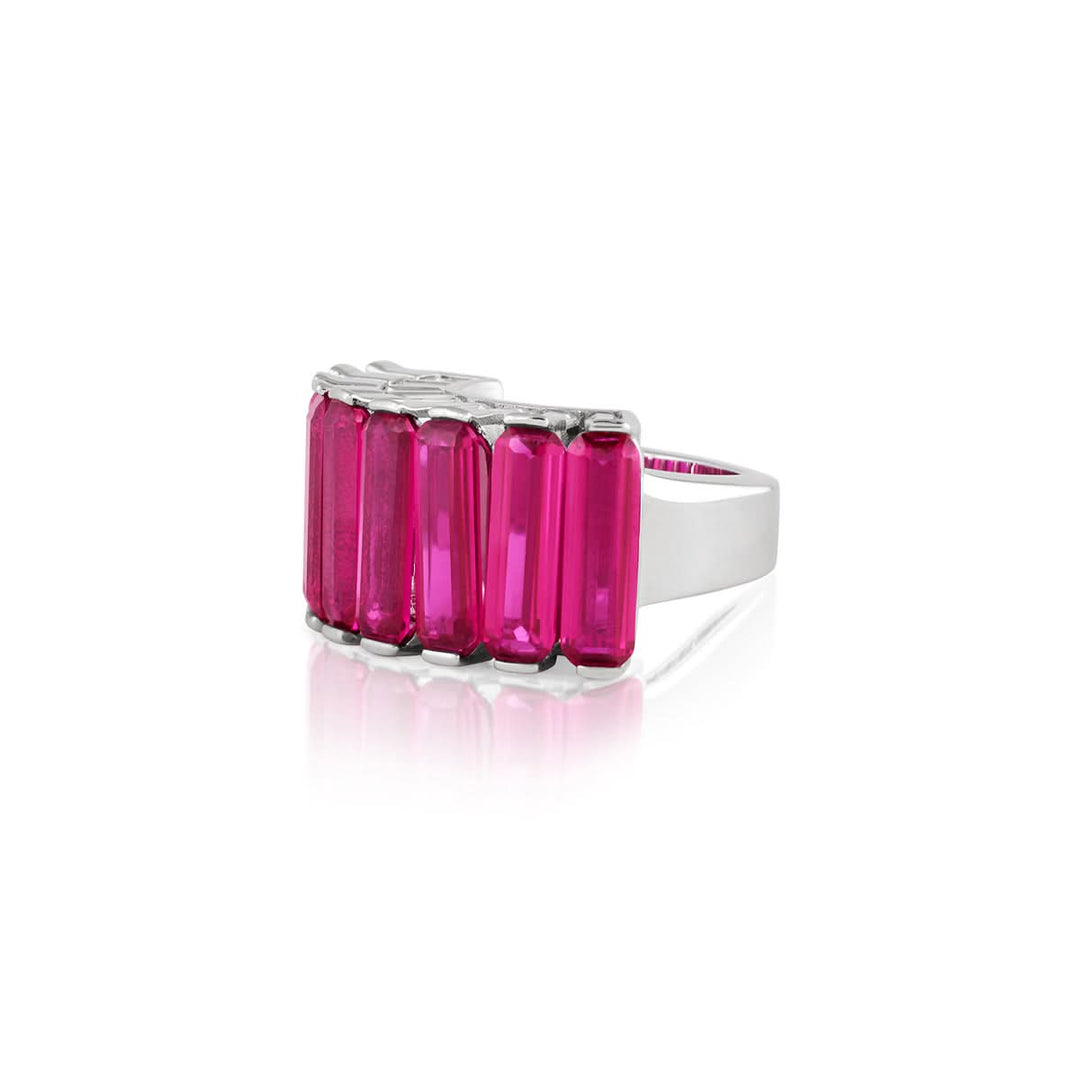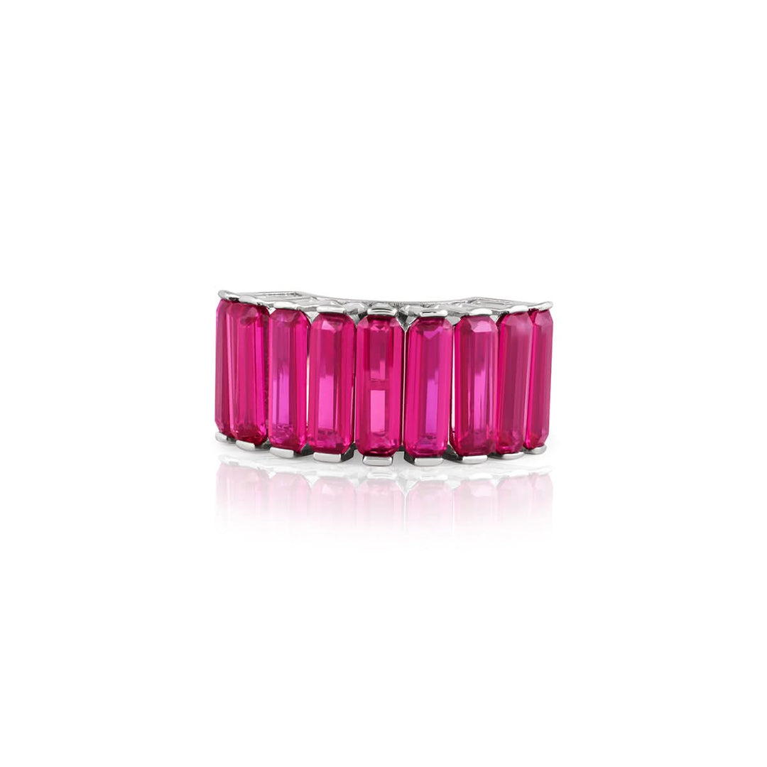This Art Deco-inspired wide baguette band ring features a stunning combination of custom-cut CZ and Ruby corumdum stones. Crafted with rhodium-plated brass, this ring adds a touch of elegance to your everyday look. Perfect for anyone who wants to add a pop of color to their outfit.