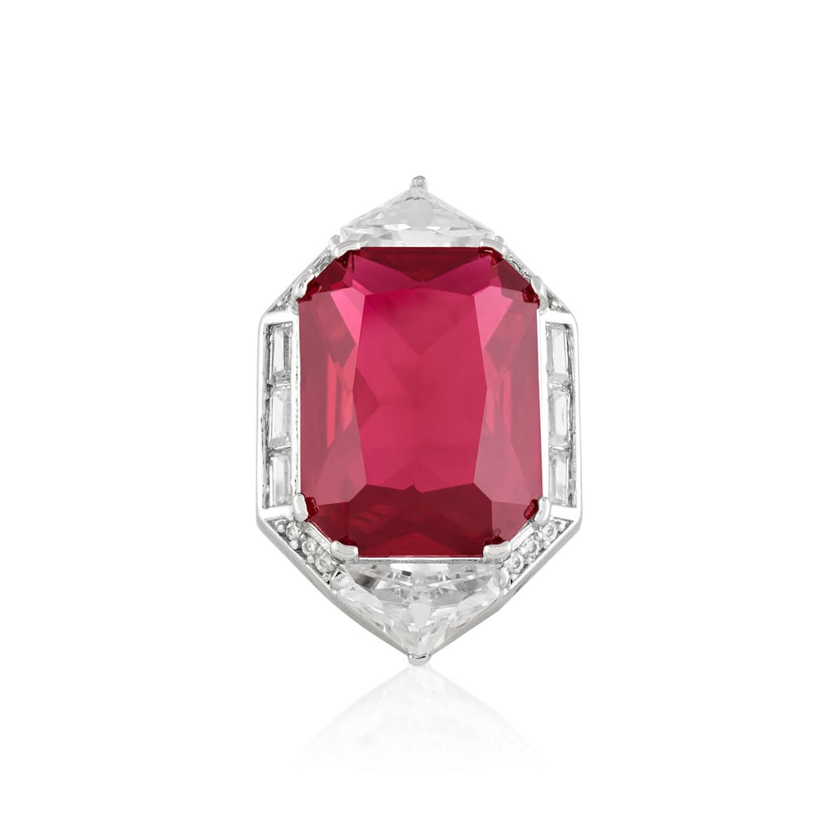 Elevate any outfit with our Ruby Corumdum Cocktail Ring. Made with custom-cut CZ stones and rhodium-plated brass, this Art Deco-inspired ring features a stunning Ruby corumdum statement stone for added oomph.