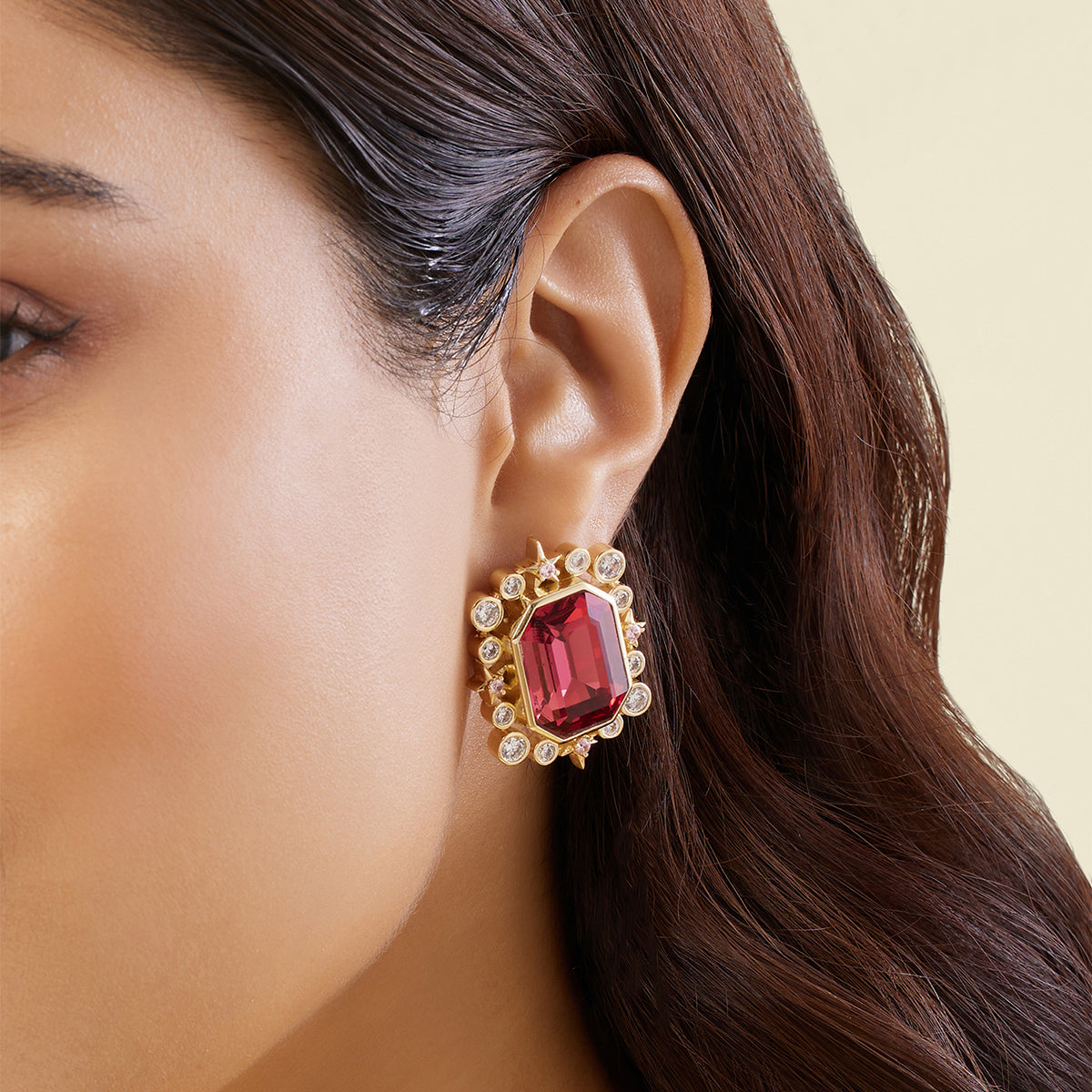 lluminate every occasion with these statement earrings, crafted in brass with 18k gold plating. Featuring crystal zirconia stones, they echo cosmic constellations and ancient symbolism. Perfect for weddings, cocktails, and festive nights.