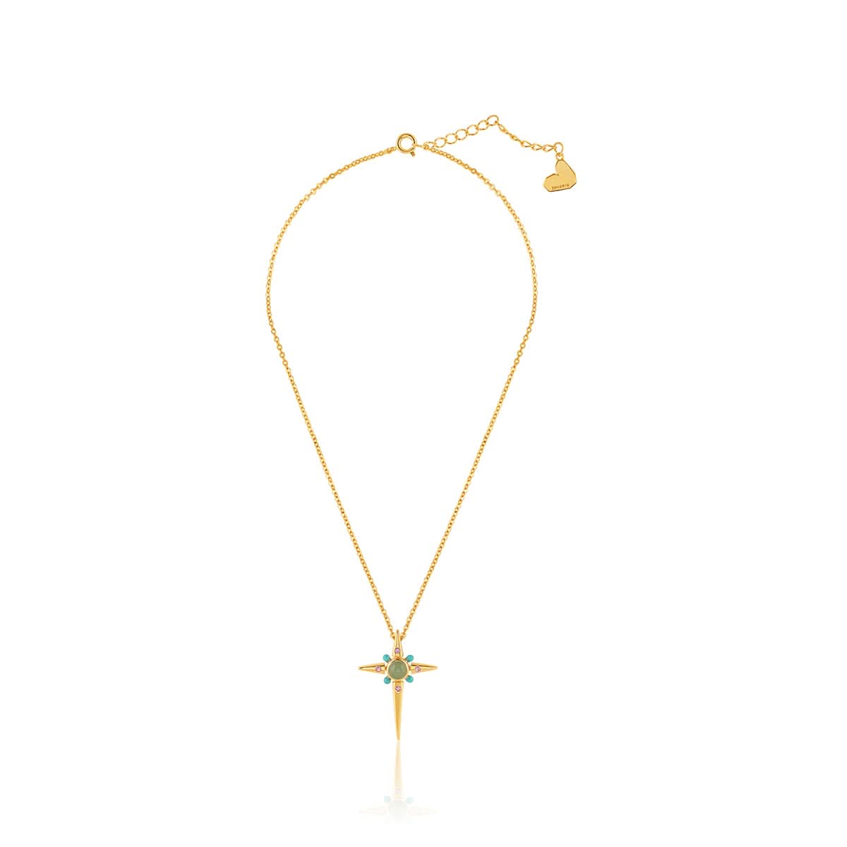 The Sacred Prism Necklace features a vibrant cross pendant with green aventurine, turquoise beads, and crystal zirconia, finished in 18k gold-plated brass. Hypoallergenic and statement-making, it’s rooted in healing energy and fearless fashion.