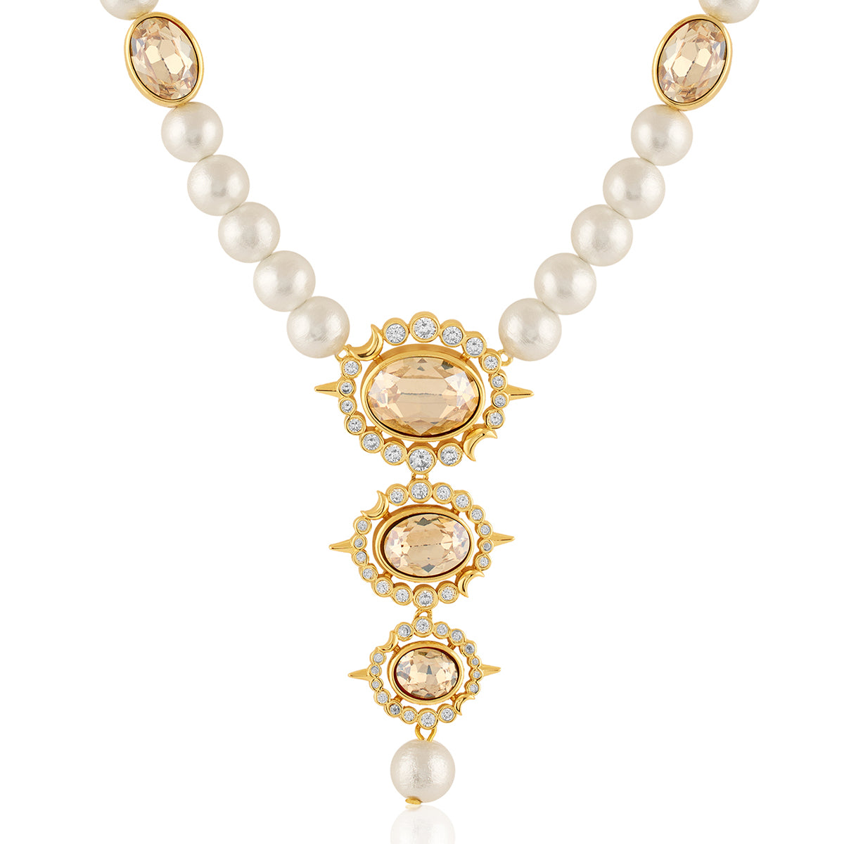 Turn every head this season with our multicolour statement necklace, crafted in brass with 18k gold plating. Adorned with crystal zirconia and pearls, it draws from cosmic constellations and ancient symbolism. Perfect for weddings, cocktails, and festive soirées.