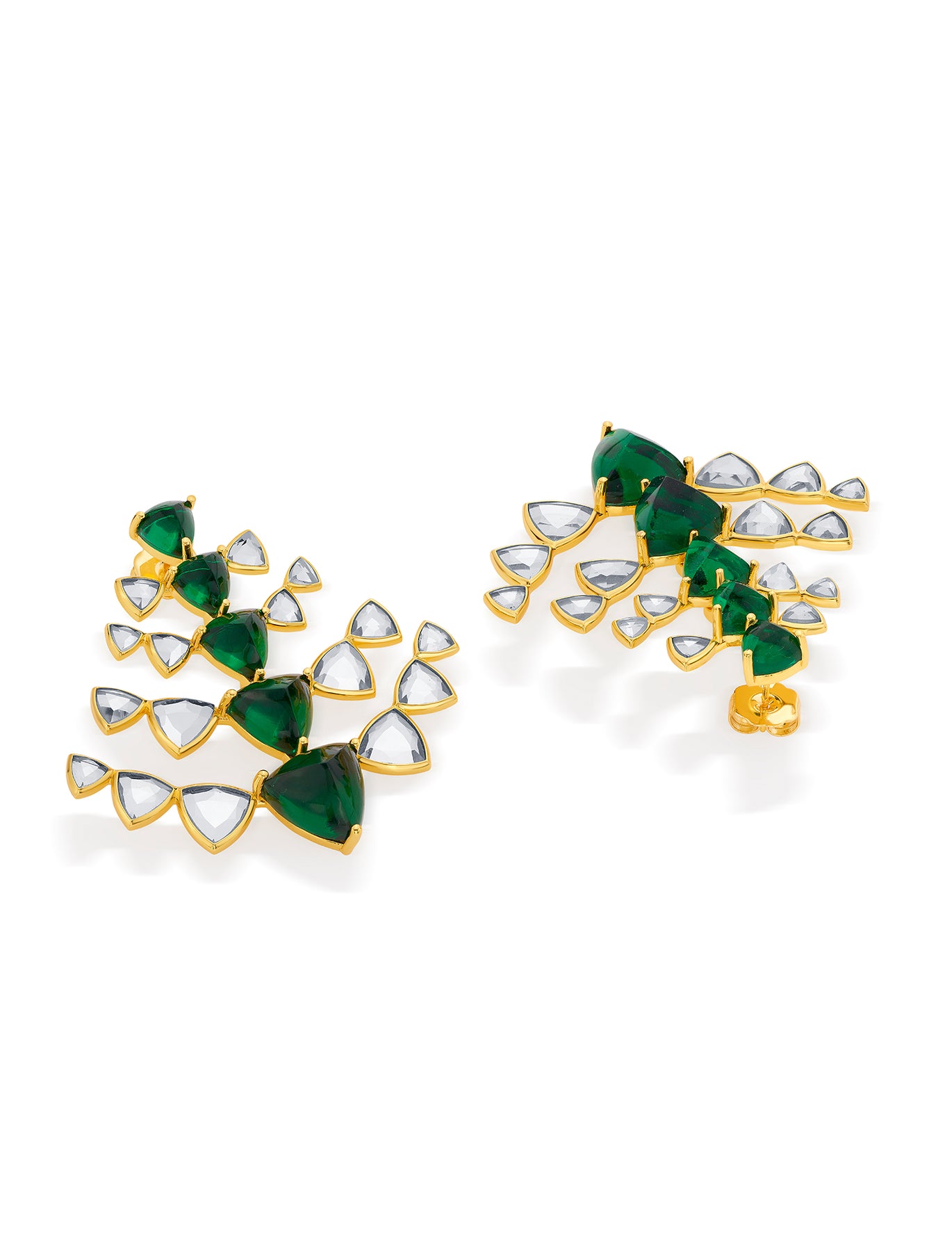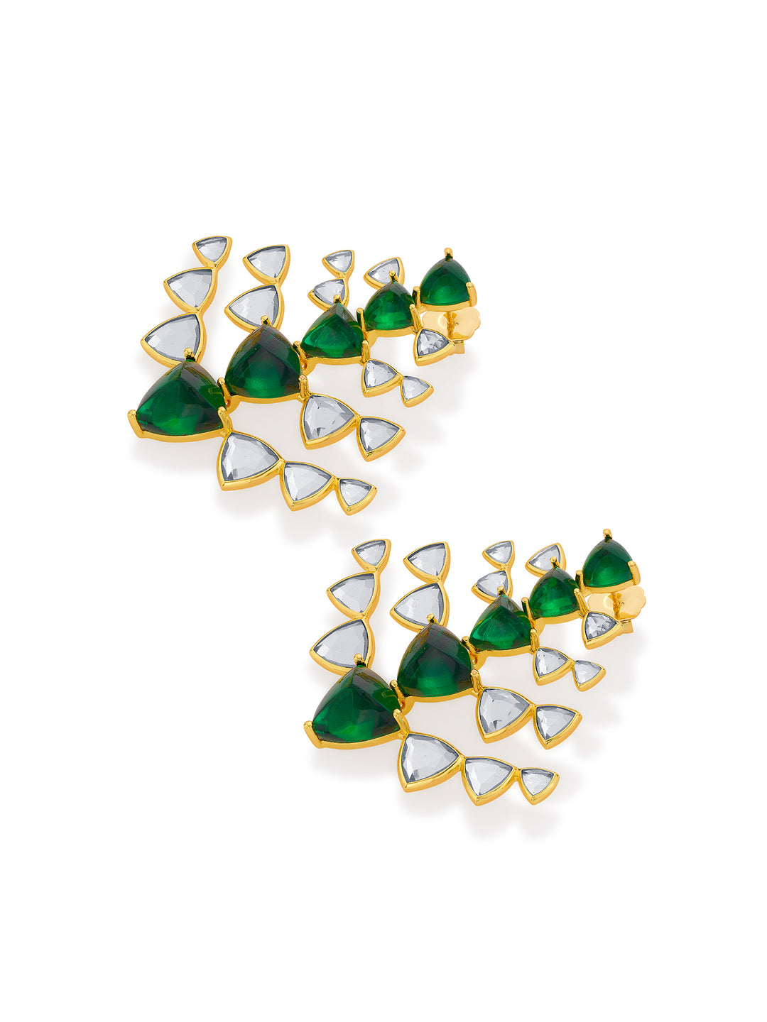 These earrings have an elegant silhouette strung with vibrant hydro emeralds and polki-cut mirrors. Style this gorgeous pair with a classic white ensemble.