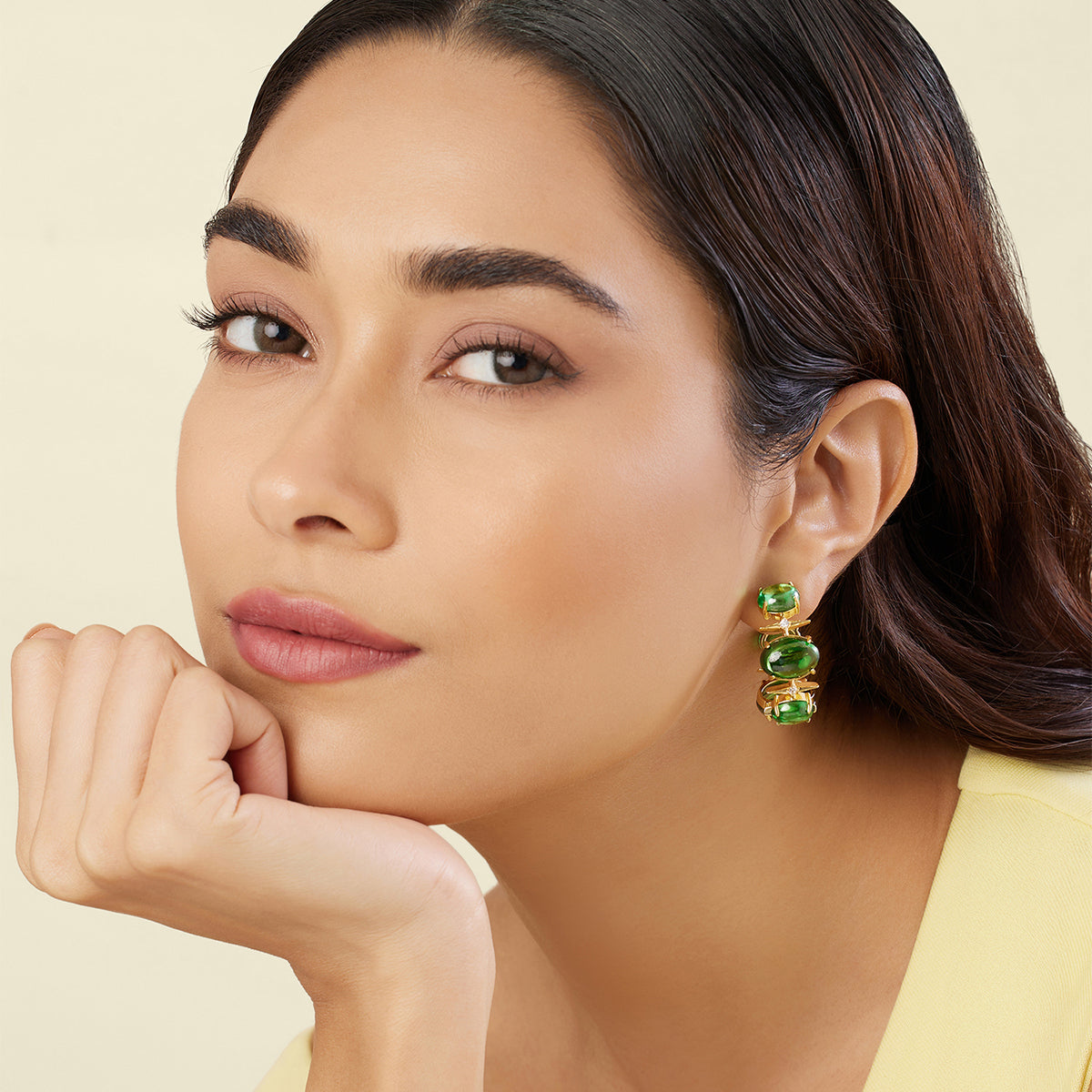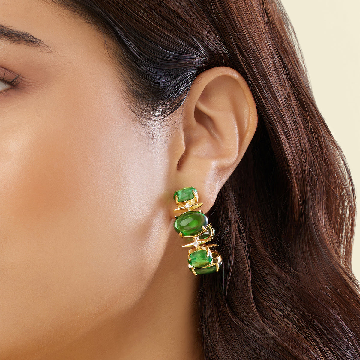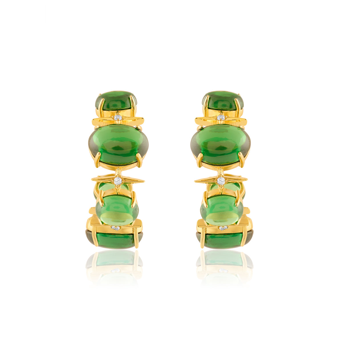 lluminate every occasion with these statement earrings, crafted in brass with 18k gold plating. Featuring crystal zirconia and cabochons, they echo cosmic constellations and ancient symbolism. Perfect for weddings, cocktails, and festive nights.