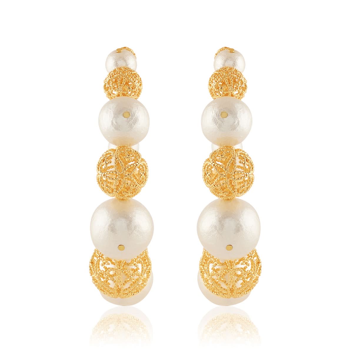 Turn heads with Isharya’s gold-and-white statement hoops. Featuring pearls and Portuguese-inspired filigree in 18k gold-plated brass, they’re hypoallergenic and built to impress. Perfect for weddings to cocktails—shop the festive must-have now.