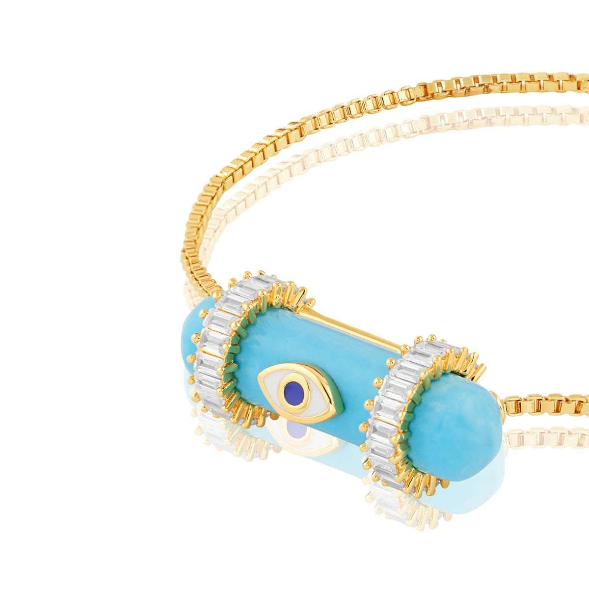 The Skyshield Bracelet features a striking turquoise stone paired with crystal zirconia and blue enamel detailing, set in luxe 18k gold-plated brass. Hypoallergenic and radiant, this piece brings serenity and strength in one chic wrap.