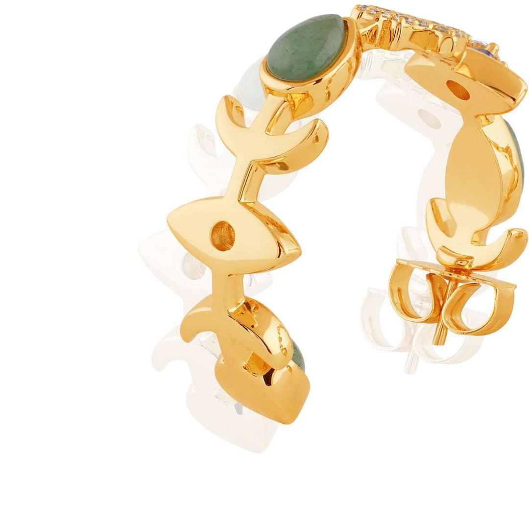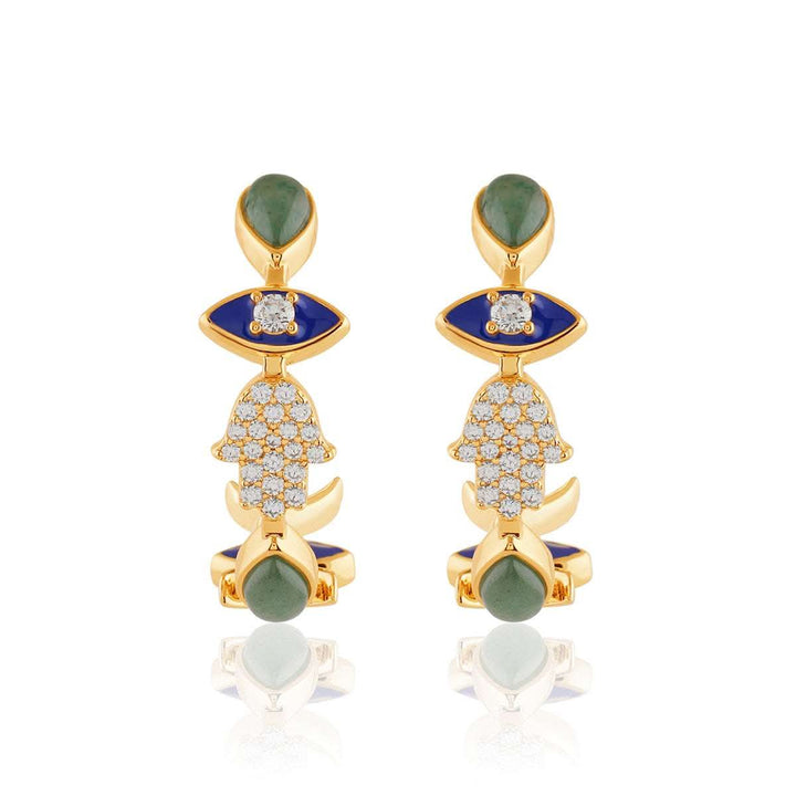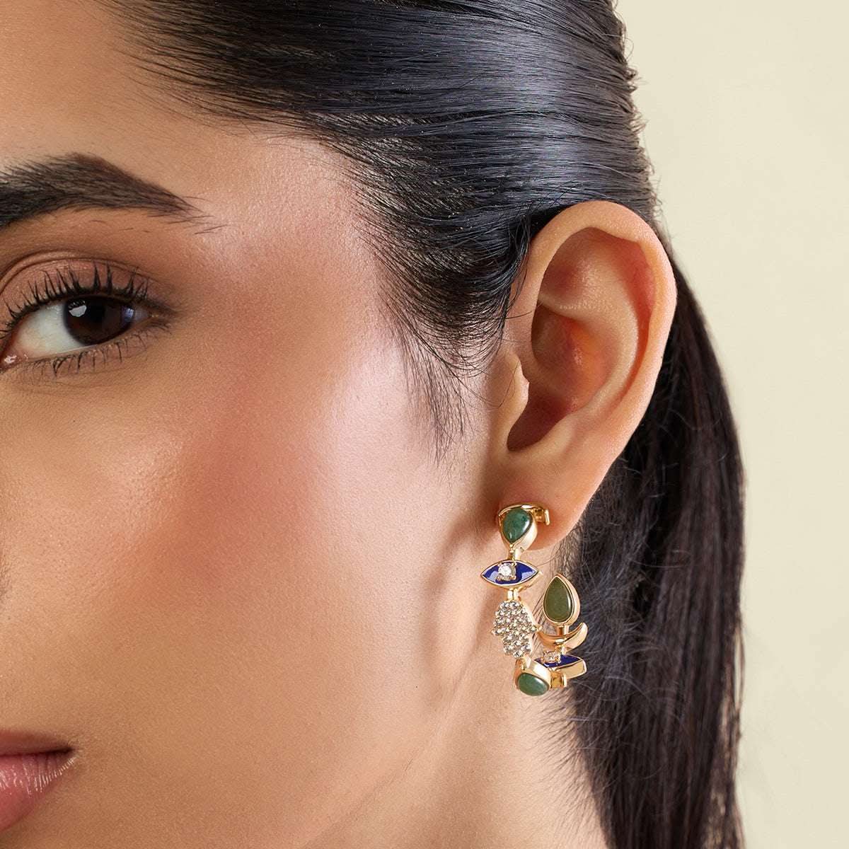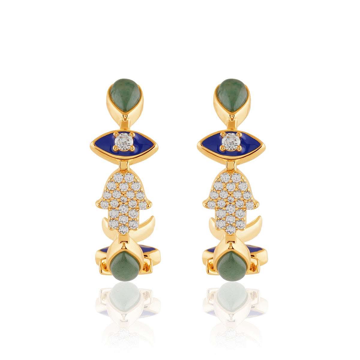 The Soul Shield Danglers are crafted in 18k gold-plated brass with blue enamel, green aventurine, and crystal zirconia. Hypoallergenic and bold, they’re infused with spiritual energy and unmatched elegance.