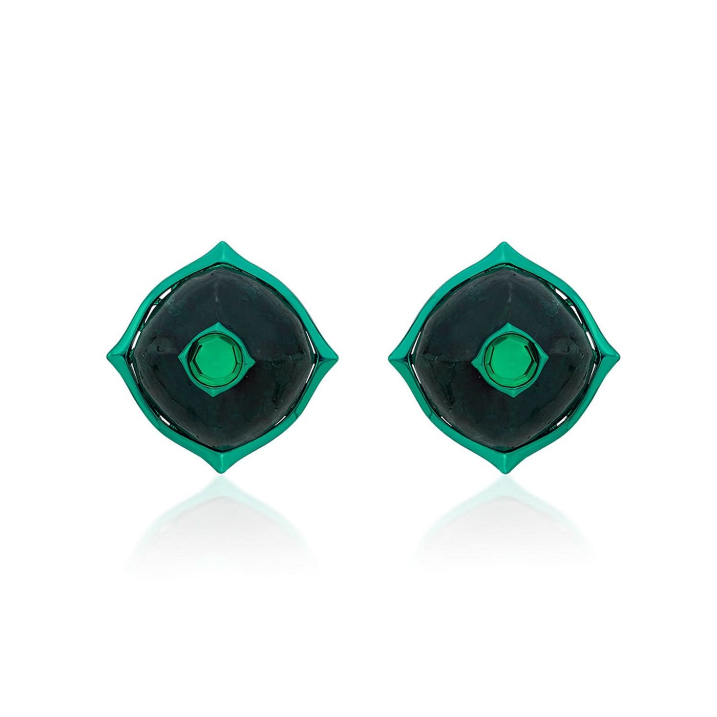 Exotic and royal, these studs are inspired by a Mughal motif and feature a dark green quartz on breathtaking emerald green metal plating.