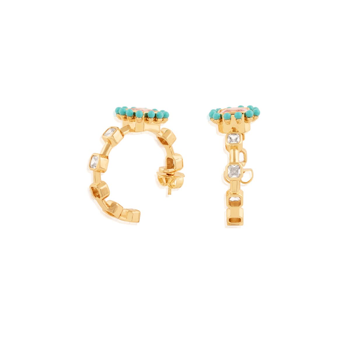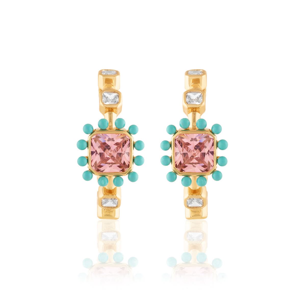 Inspired by the playful spirit of summer, these earrings are crafted in brass and plated with 18k gold. Featuring brilliant crystal zirconia stones, these lightweight earrings offer the perfect pops of colour to everything from sundresses to linen shirts.