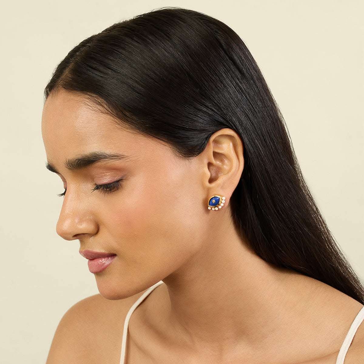 Inspired by the playful spirit of summer, these earrings are crafted in brass and plated with 18k gold. Featuring lapis lazuli, pearls and crystal zirconia stones, these lightweight earrings offer the perfect pops of colour to everything from sundresses to linen shirts.