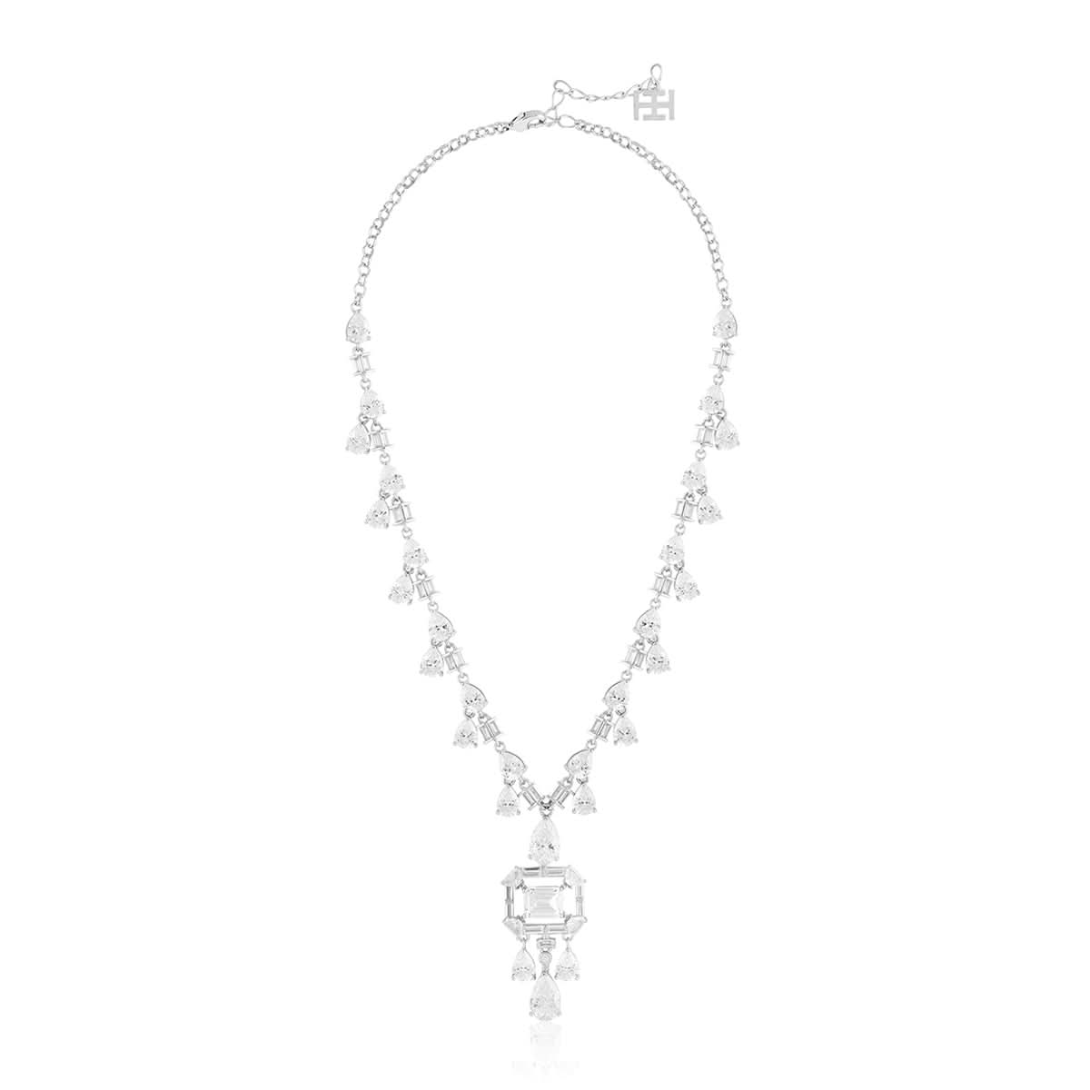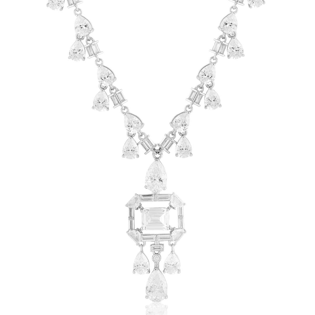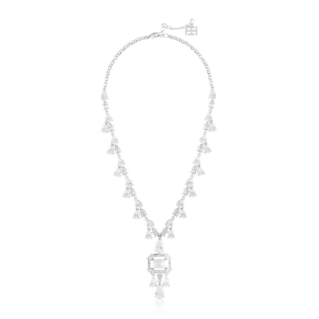 The Timeless Elegance Long Necklace from Isharya’s High Collection exudes sophistication with high-quality crystal zirconia stones and rhodium-plated brass. This bold statement piece in silver and white is perfect for cocktail parties, social gatherings, and festive occasions.