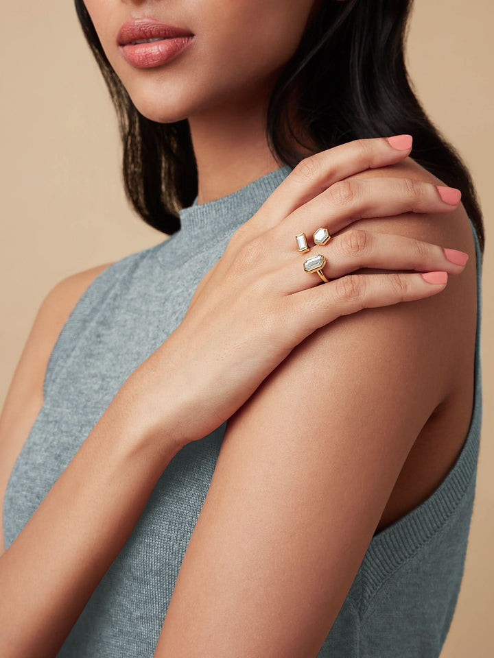 Minimal adjustable open ring made of hand-cut polki mirrors in gold-plating. Pack in an impactful punch with this ring, adding sparkle to anything.