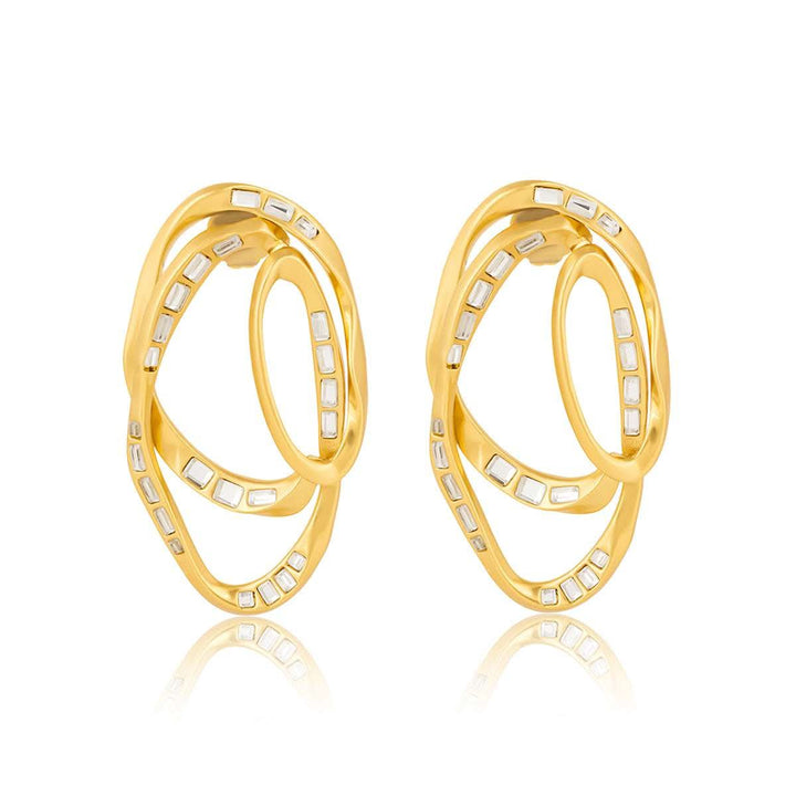 These vintage-inspired Triple The Joy Earrings are crafted in brass and plated with 18k gold. They feature exquisite mirror work and can be styled with everything from heirloom sarees to cocktail dresses for every celebration.