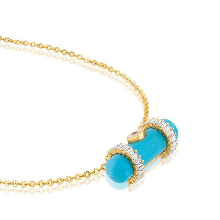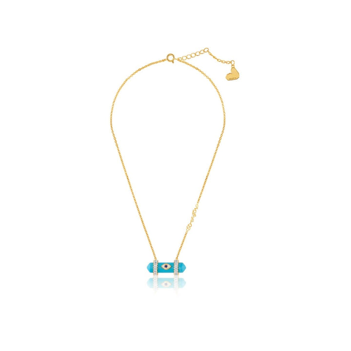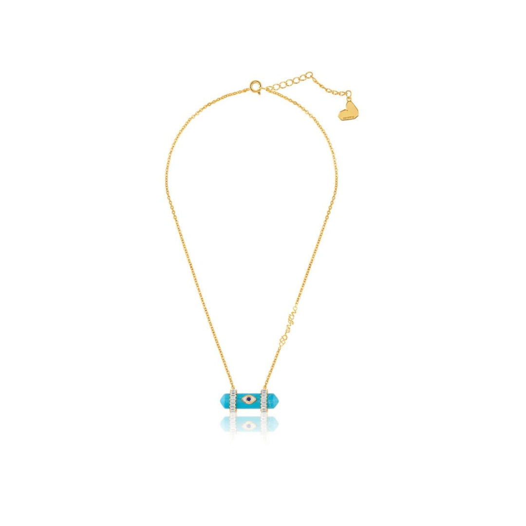 The Tranquil Eye Necklace features a turquoise stone framed in blue enamel and crystal zirconia, set in 18k gold-plated brass. Hypoallergenic and energy-rich, it’s inspired by healing symbols and modern spirituality.