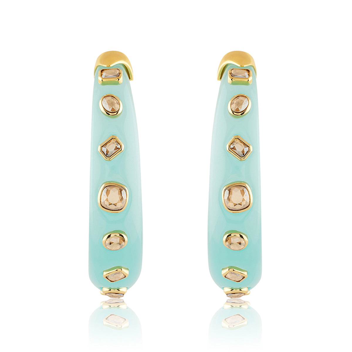 Elevate your look with this bold earring in turquoise and gold, featuring crystal zirconia and resin work. Crafted from 18k gold-plated brass, it draws inspiration from whimsical garden motifs like flowers and dragonflies. Hypoallergenic and luxurious.