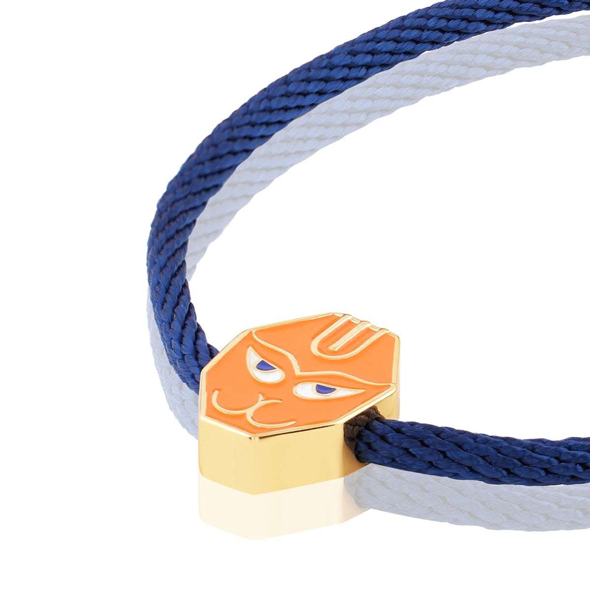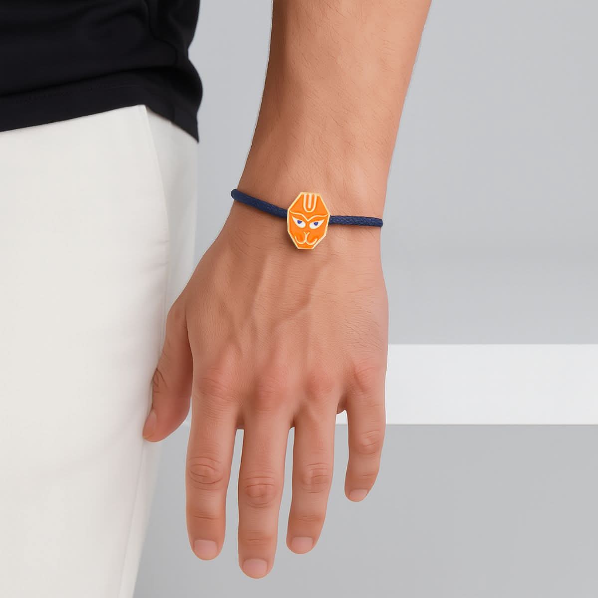The Veer Rakhi Bracelet is a bold Raksha Bandhan piece featuring a Hanuman motif with orange enamel and crystal zirconia, set on a blue cord with 18k gold-plated brass. Hypoallergenic and powerful, it blends spiritual symbolism with modern design.