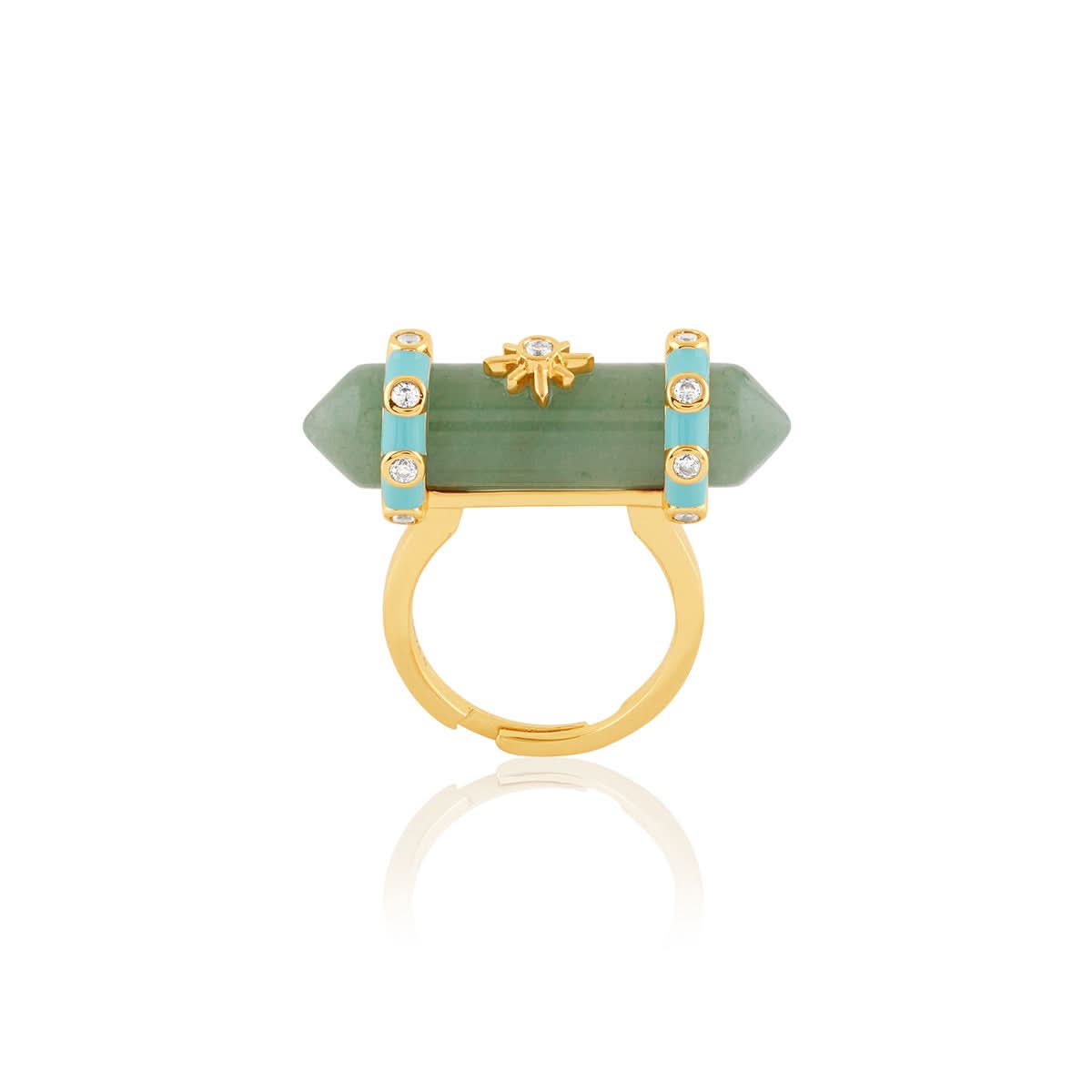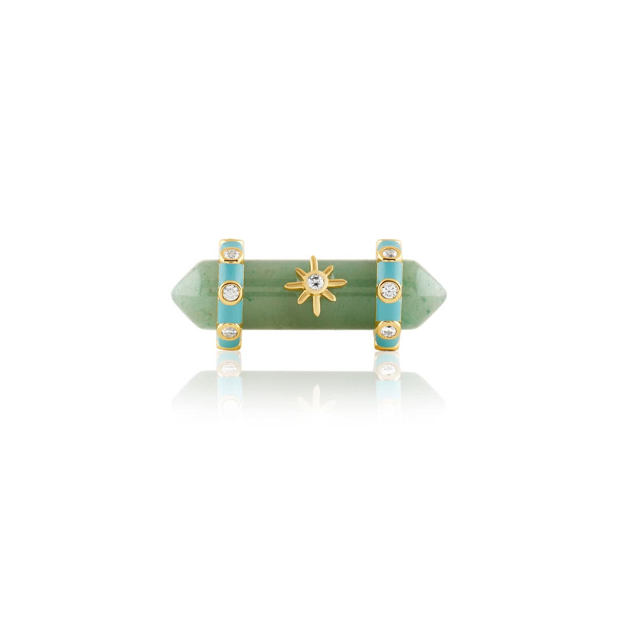Channel balance and boldness with the Verdant Vibe Amulet Ring. Featuring a green aventurine stone, blue enamel detailing, and sparkling crystal zirconia, this 18k gold-plated ring is where healing meets high style. Pair it with denim or festive wear for an effortlessly luxe look.